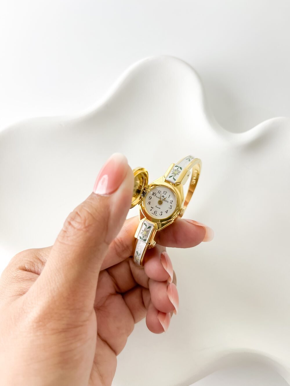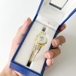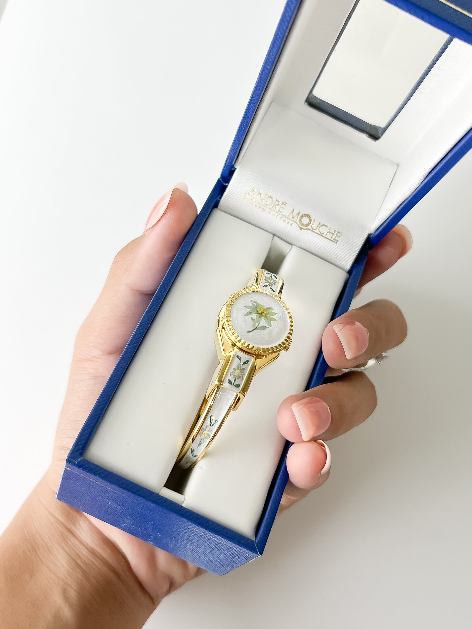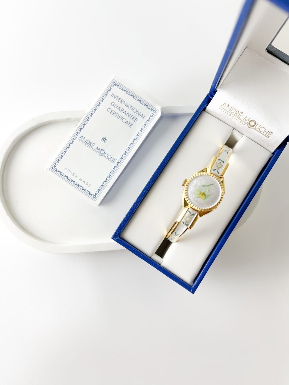 Andre Mouche occupies a singular space in Jura-region horology, operating from their workshop in Fahy since 1961. Unlike the industrial rigidity of many luxury houses, Mouche maintains the traditional “peinture sur émail” technique, where each petal is a testament to the painter’s steady hand. This piece houses a reliable Swiss Quartz heart within its 18k Aurum-plated frame, blending mid-century romanticism with the unwavering accuracy of modern timekeeping. To possess this watch, complete with its original box, is to own a wearable canvas that ignores the frantic pace of the digital world in favor of a slower, more soulful rhythm.