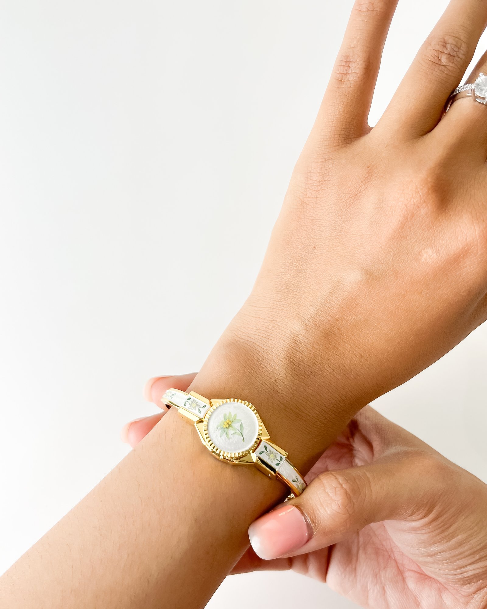 The cool, vitrified surface of the enamel feels like a smooth river stone against the skin, carrying a deceptive weight that speaks to its artisanal origin. As the spring-loaded cover snaps open, it reveals a hidden dial, much like a secret kept within a locket. The hand-painted floral motifs—rendered in soft hues of Rose and Leaf—capture the light with a ceramic depth, making the watch feel less like a tool and more like a fragment of a Swiss spring morning fastened to your pulse.
