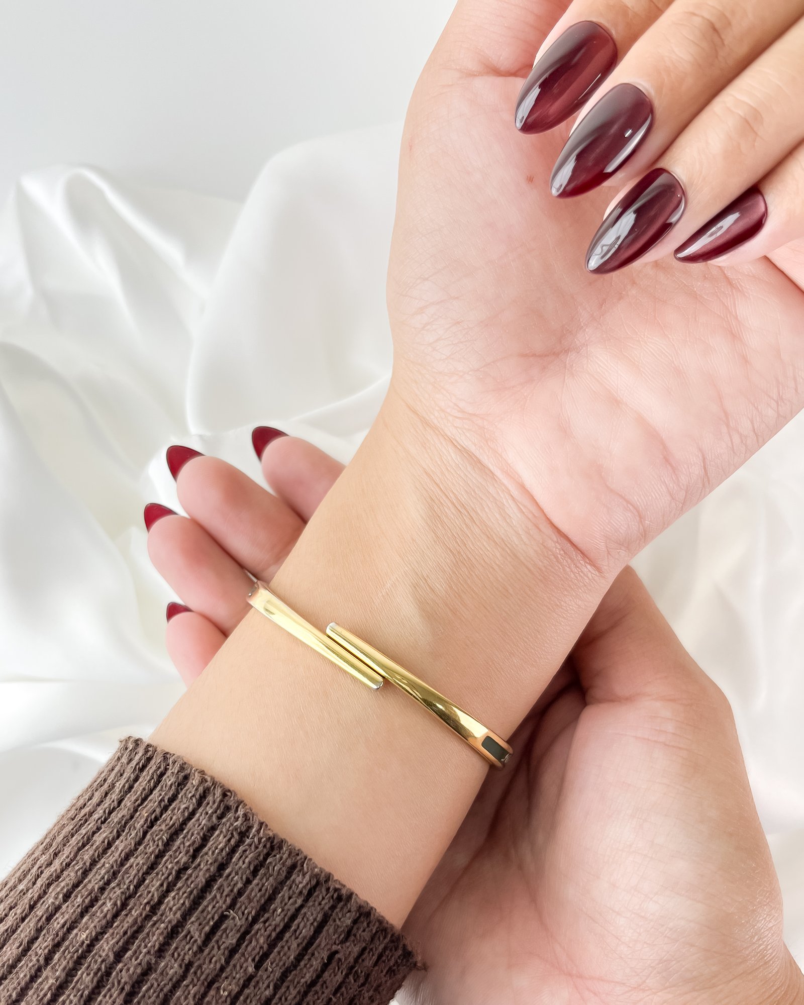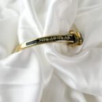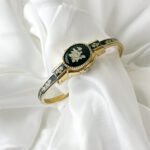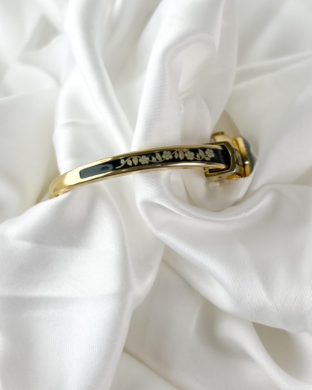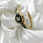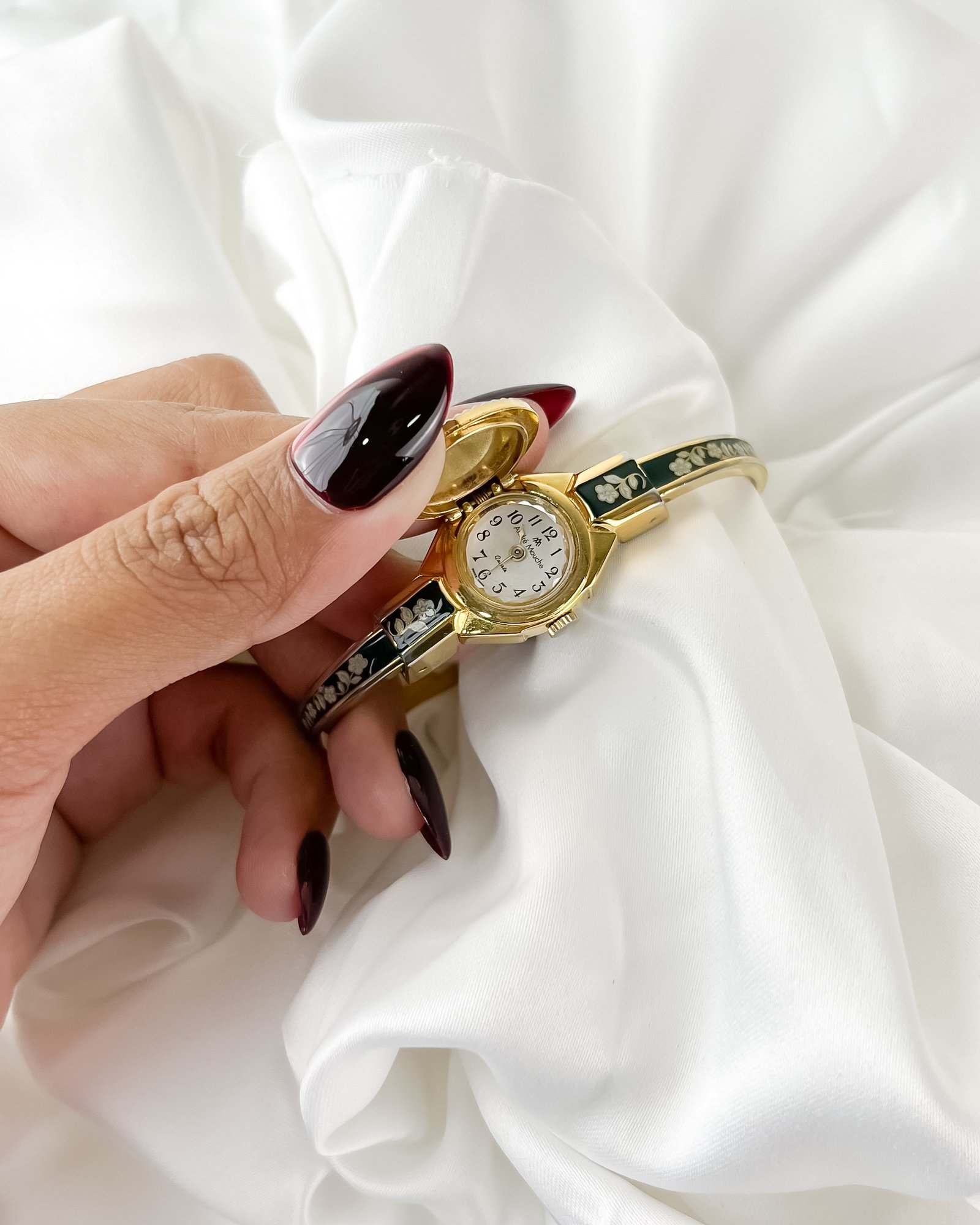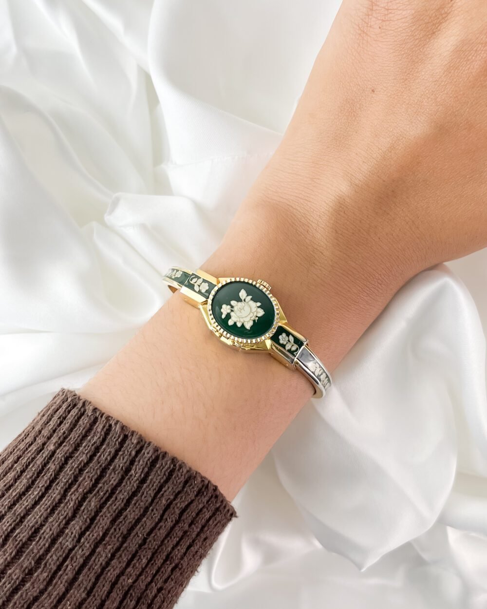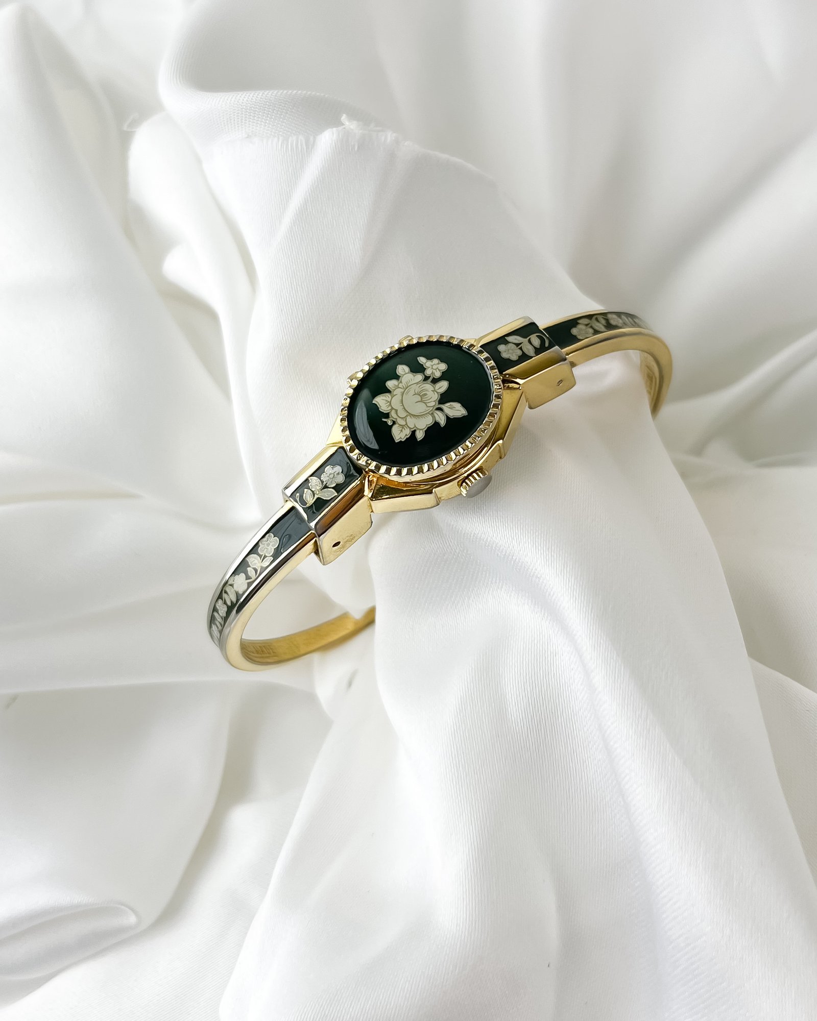 The cool, polished Aurum finish of the bangle rests with a surprising lightness against the pulse, immediately warming to the temperature of your skin. This is not merely a keeper of hours; it is a miniature gallery worn on the wrist. When the hand-painted cover is closed, the eye is drawn to the deep, Moss-green enamel and the delicate ivory rose that blooms across it. It feels like wearing a hidden memory—a quiet, private piece of art that only reveals the passage of time when you choose to lift the lid.