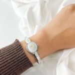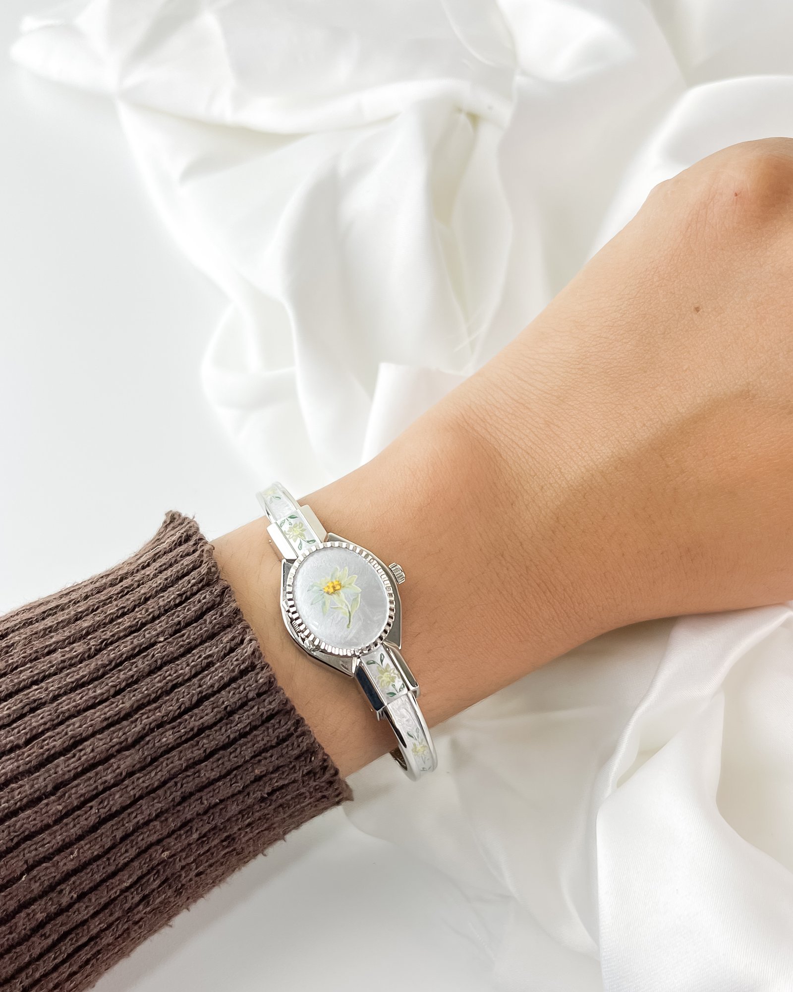 The cool, polished Mercury finish of the bangle rests with a surprising lightness against the pulse, immediately warming to the temperature of your skin. This is not merely a keeper of hours; it is a miniature gallery worn on the wrist. When the hand-painted cover is closed, the eye is drawn to a delicate Alpine bloom shimmering against a frosted pearlescent background. It feels like wearing a hidden memory—a quiet, private piece of art that only reveals the passage of time when you choose to lift the lid.