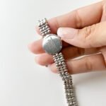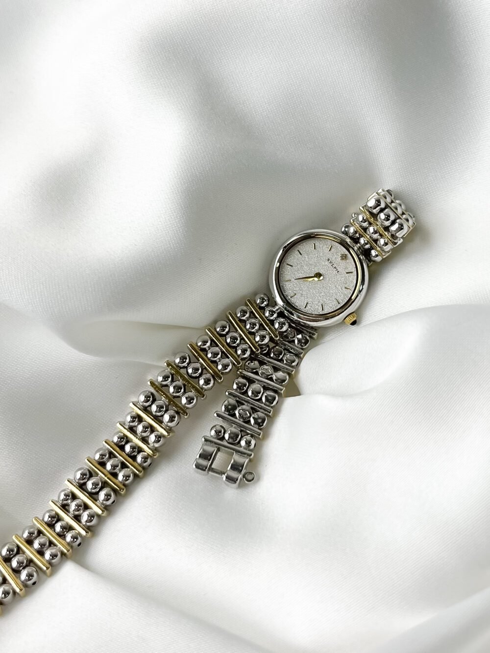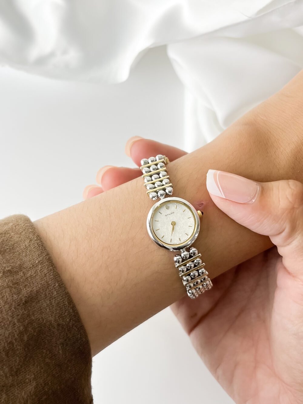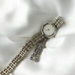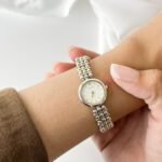 The watch wraps around the wrist with the fluid lightness of a silver silk thread, its Mercury-toned link architecture warming instantly against the skin. As the arm moves, the brushed Frost surfaces catch fragments of the room’s light like Moonlight reflecting off a quiet pond, while the champagne-toned dial offers a soft, sandy depth. It is an accessory that prioritizes tactile serenity, turning the simple act of checking the hour into an intimate, sensory experience.