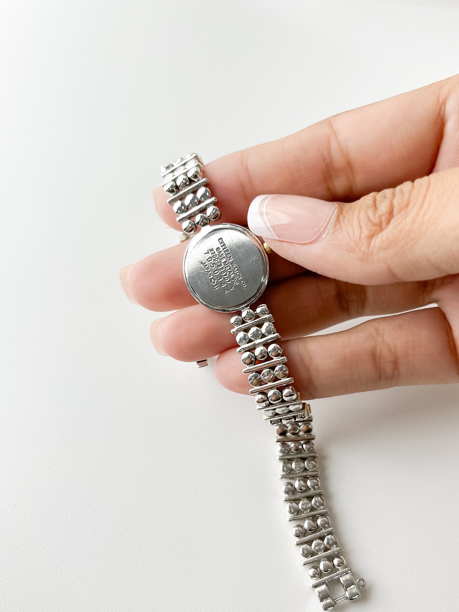 Hailing from a peak era of Japanese quartz refinement, this Citizen utilizes the ultra-compact 2200 caliber—a movement specifically engineered to allow for extreme miniaturization in high-tier jewelry timepieces. The design is defined by its distinctive oval “stepped” case and integrated open-link bracelet, reflecting a mid-1990s aesthetic that favored structural airiness and functional grace. Preserved in its original mahogany-toned sanctuary, this piece serves as a preserved testament to a time when horology was curated as a delicate personal ornament.