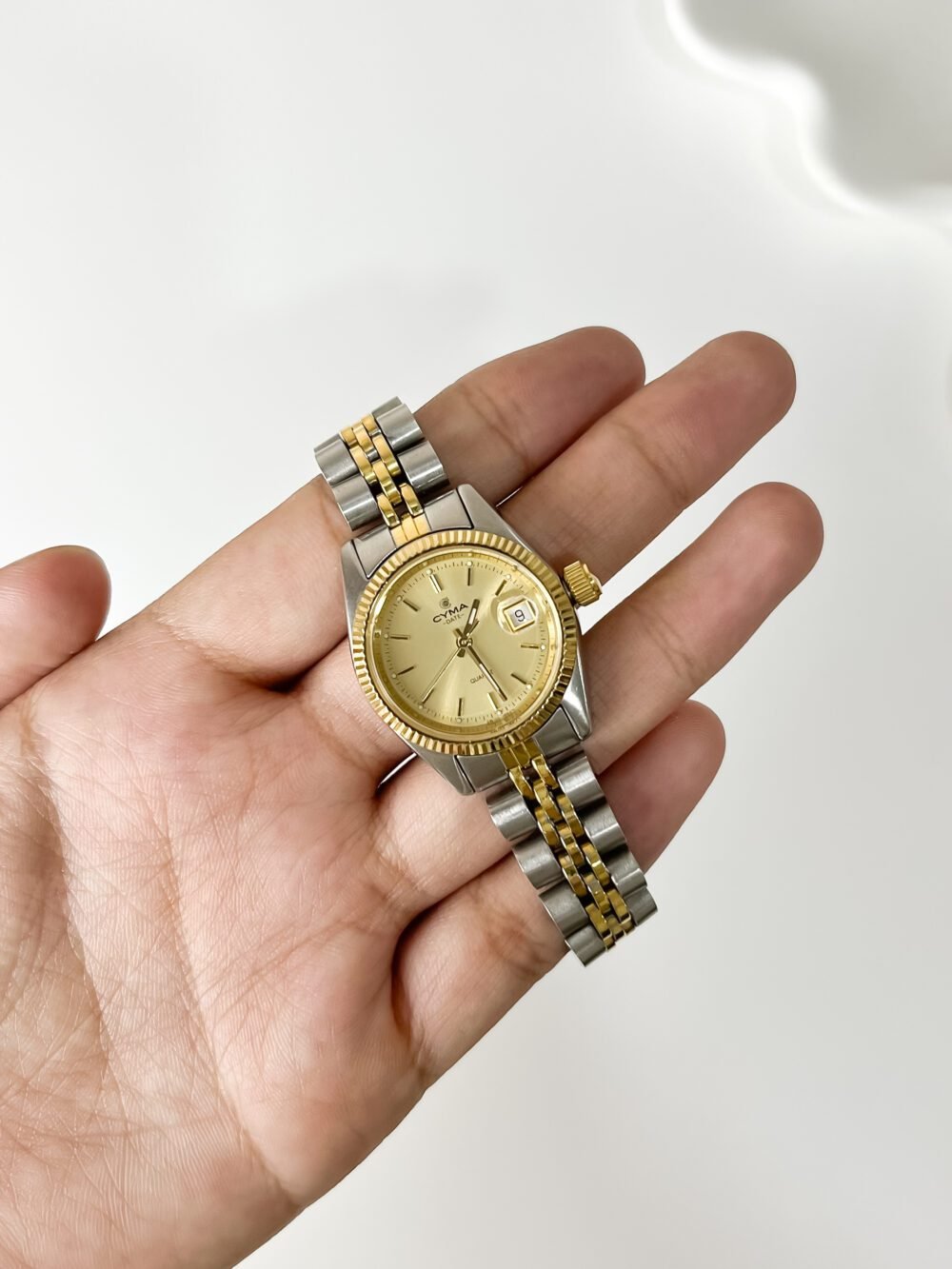 Hailing from Le Locle, the very cradle of Swiss horology, CYMA has been refining the art of the wrist since 1862. This reference 1051169 is a sharp example of the brand’s late 20th-century prowess, utilizing a high-grade Swiss Quartz movement for those who demand precision without the daily ritual of winding. The design draws from the great Swiss traditions of the “everyday luxury” watch, featuring a jubilee-style bracelet and a fluted bezel that were hallmarks of the era’s professional aesthetic. It represents a time when CYMA focused on bridging the gap between rugged durability and jewelry-like finishing, resulting in a watch that feels as sturdy as it is beautiful.