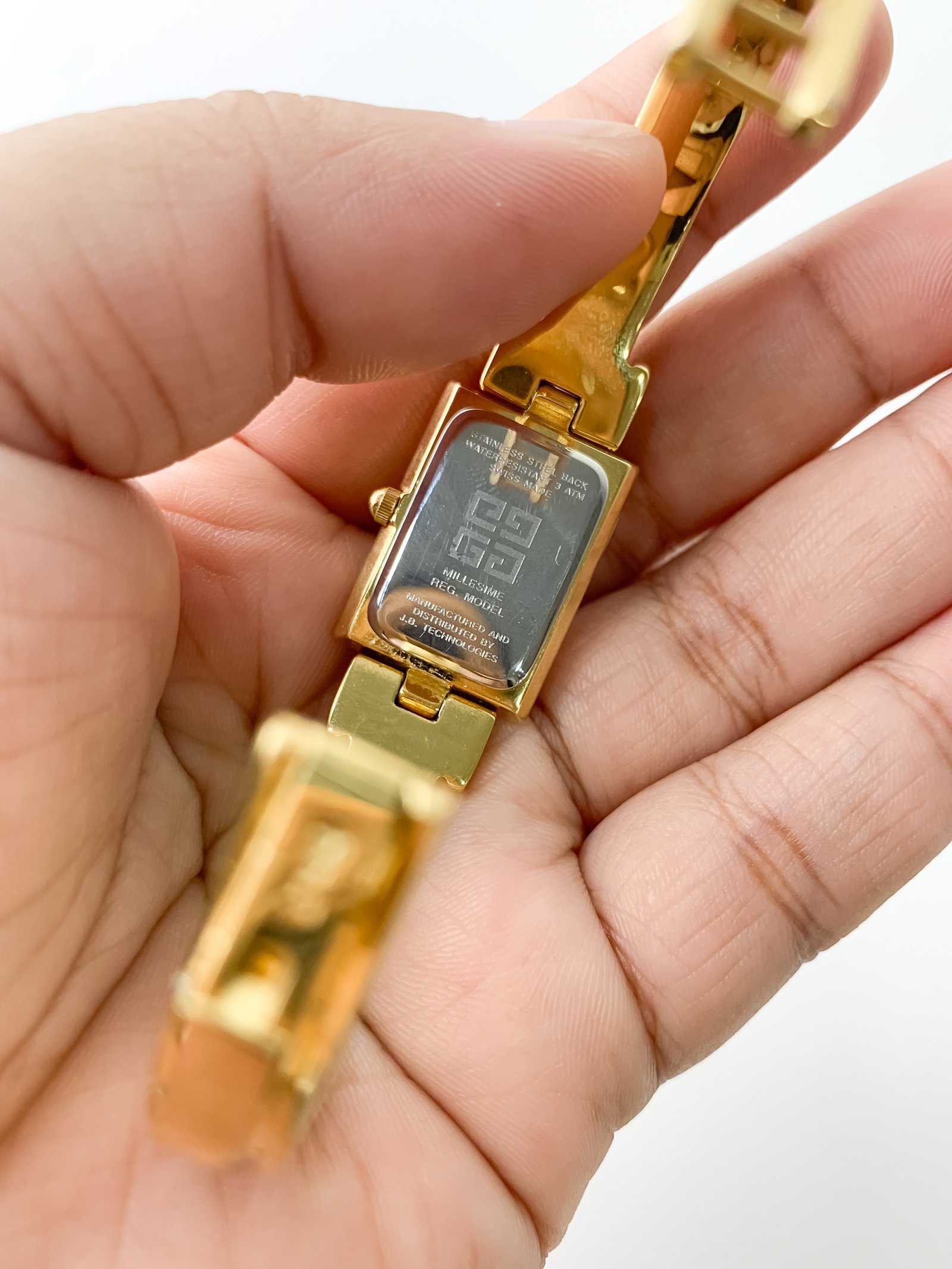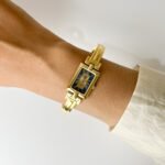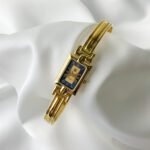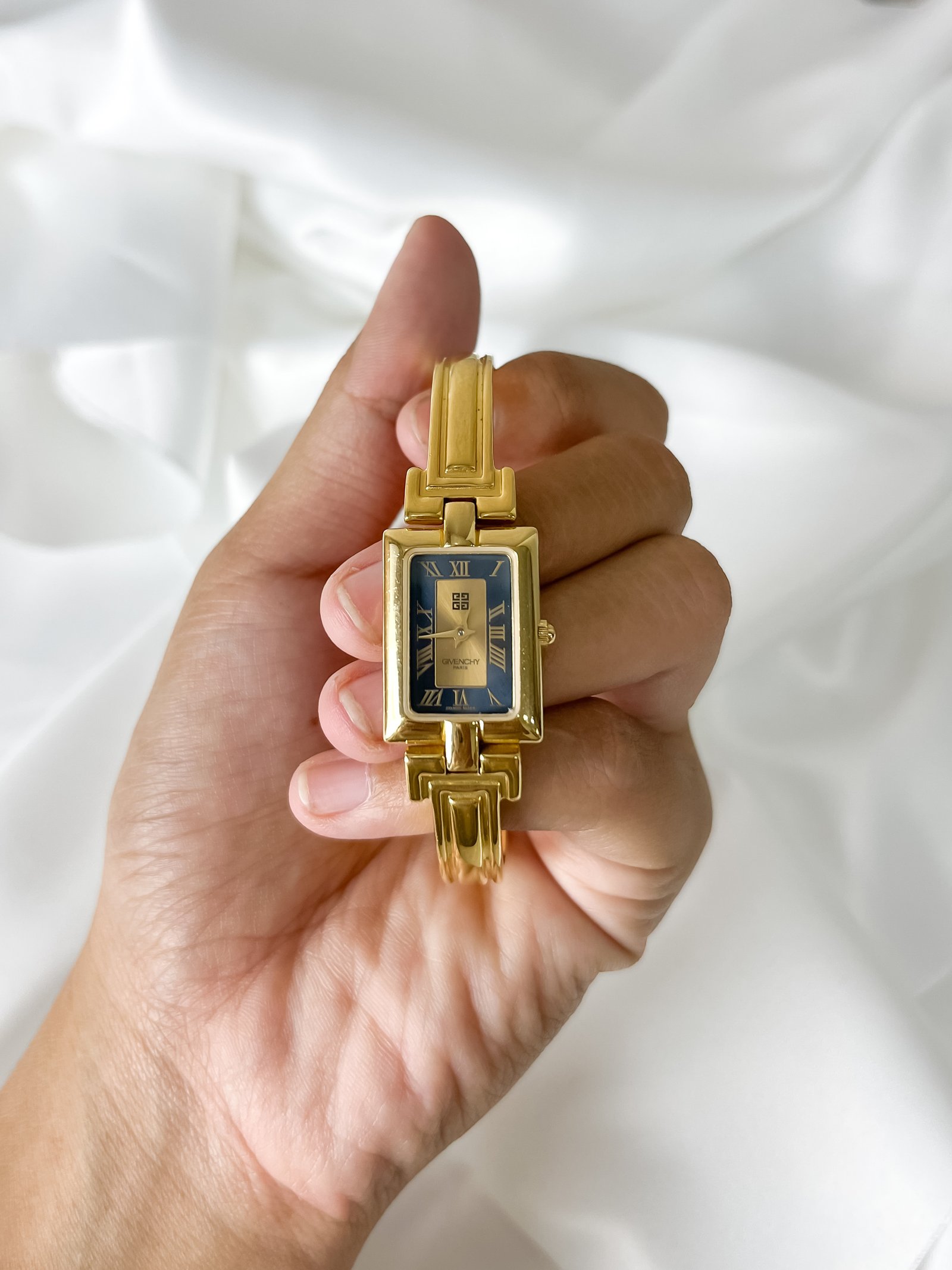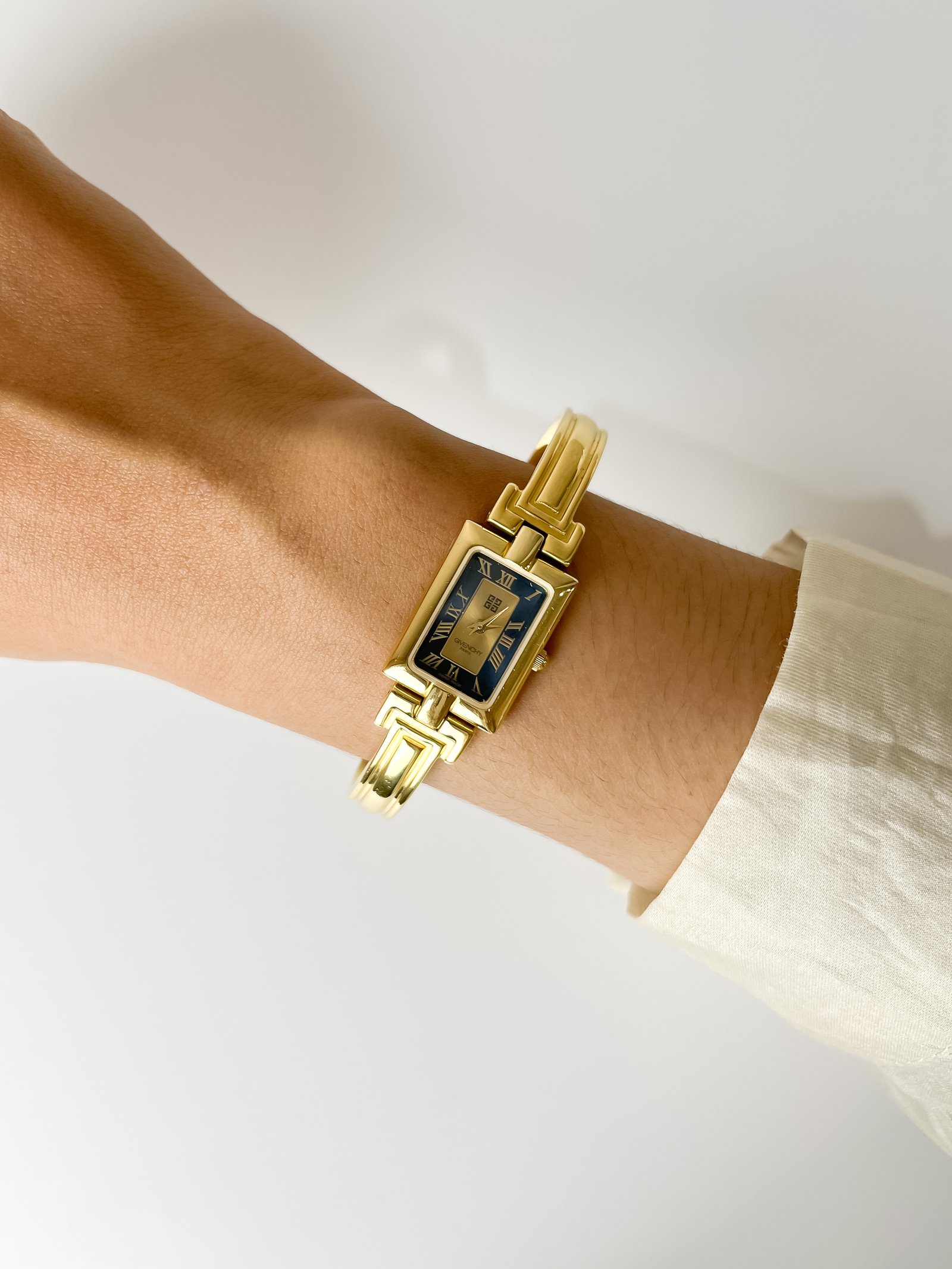 Embodying the soul of Parisian chic, this Givenchy Millesime is less of a timepiece and more of a whispered secret from a forgotten gala. It sits upon the wrist with the structural grace of an architectural heirloom, catching the light like the Seine at twilight. With its rigid, golden bangle and a dial that mirrors the deep sapphire of a midnight sky, it feels refined, poetic, and quietly sweet—a vintage treasure for the woman who carries her own light.