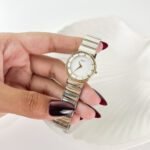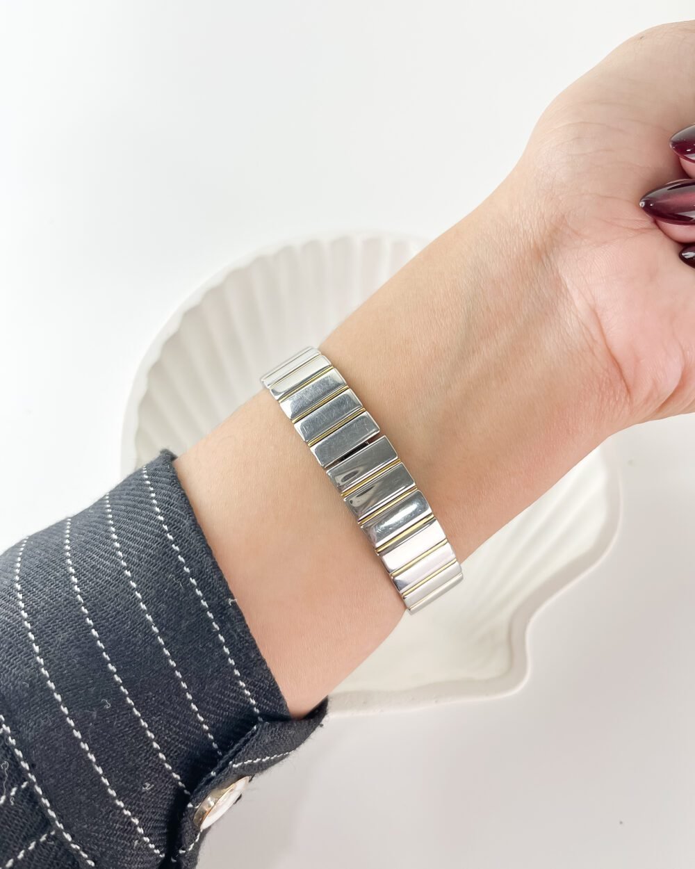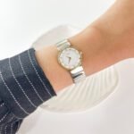 The brushed Mercury finish of the integrated links drapes with a liquid-like smoothness over the wrist, punctuated by narrow bands of Aurum that catch the light in rhythmic intervals. It sits with an incredibly low profile, almost becoming one with the skin—a testament to a design era that prioritized silhouette and fluid movement. Every time the hand shifts, the Late Sun glow of the bezel provides a warm contrast to the crisp, white dial, creating a presence that is both grounded and exceptionally light.