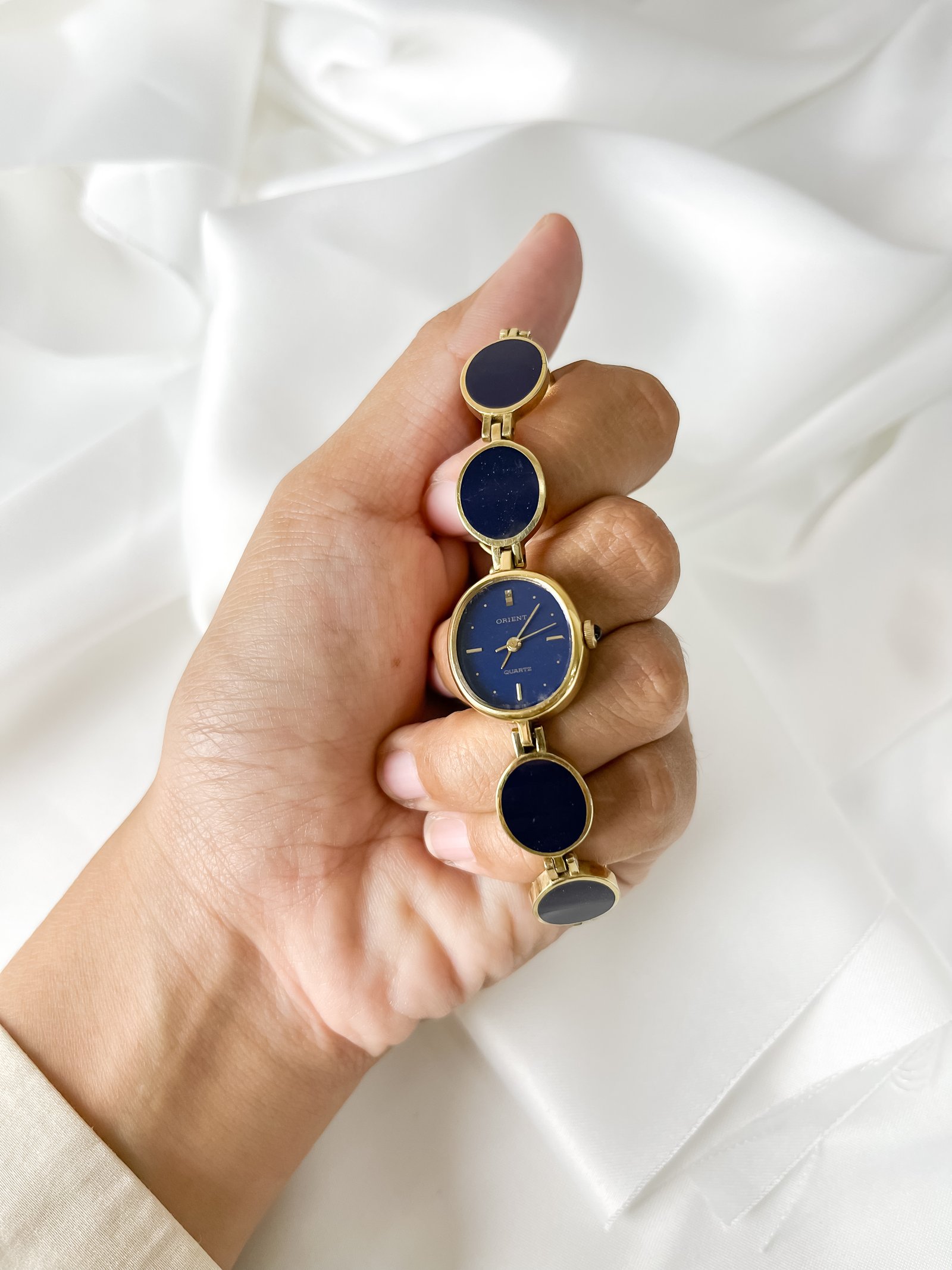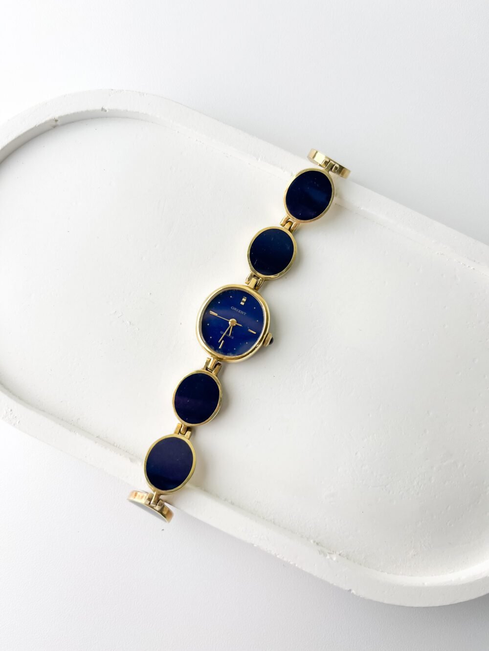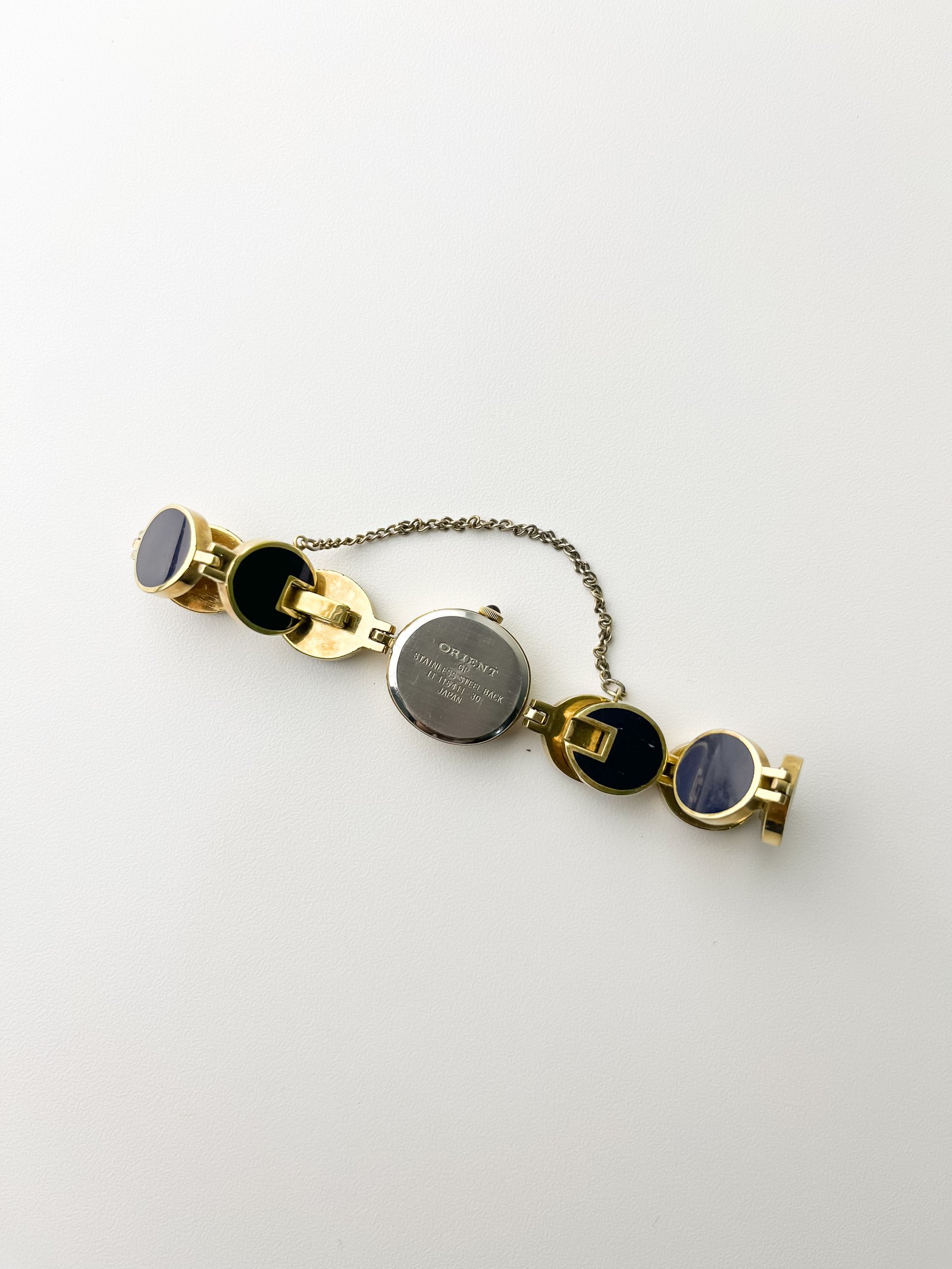 Orient has always carved its own singular path in Japanese horology, separate from the more traditionalist schools of the era. This reference IT 115411-30 showcases the brand’s penchant for daring, jewelry-inspired architecture during the late 20th century. Powered by a reliable Japanese quartz heartbeat, it represents a period when Orient challenged the convention of what a watch bracelet should look like, turning a timekeeper into a rhythmic sequence of deep-blue discs. Still accompanied by its original box, it is a preserved fragment of Japan’s adventurous design history.