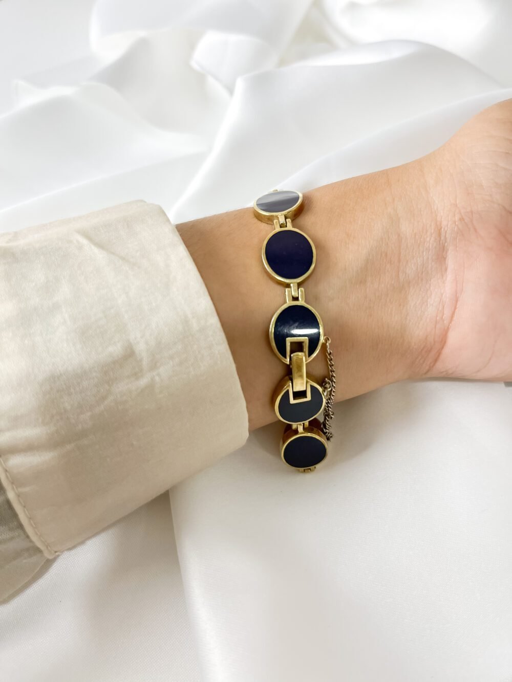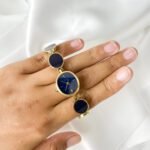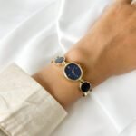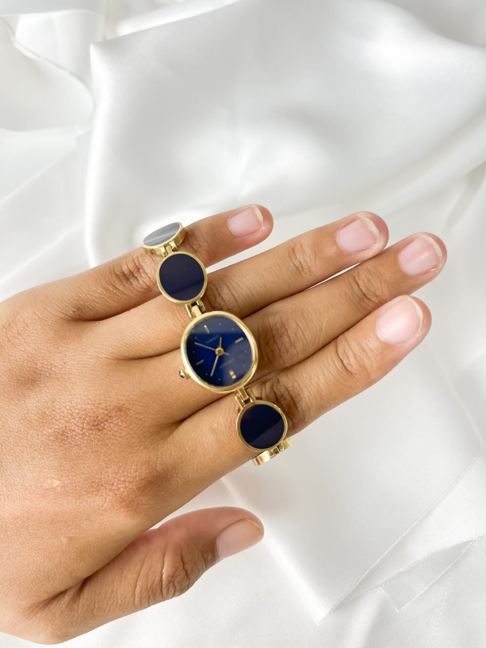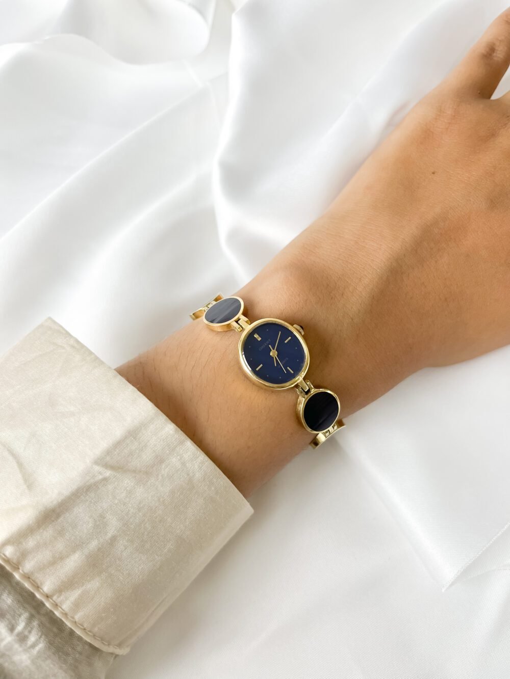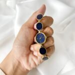 Resting against the skin, the smooth aurum links feel like a series of warm, golden coins linked in a rhythmic chain. The dial is not just blue; it is the deep, liquid shade of the sky ten minutes after sunset—a quiet midnight that seems to swallow the light rather than reflect it. It sits with a weightless grace, behaving less like a tool and more like a curated piece of geometry that happens to keep time.