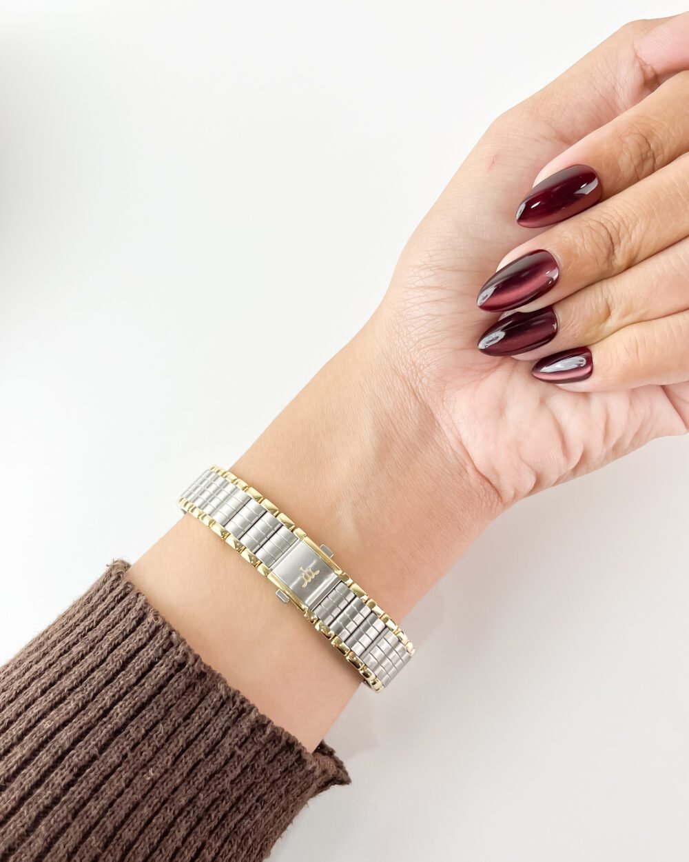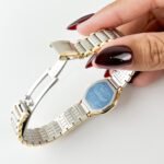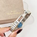The cool, brushed Mercury finish of the integrated bracelet flows against the pulse like liquid silk, accented by the soft glow of Honey-gold links that shimmer with every gesture. Resting on the wrist, the petite case feels almost weightless, yet its presence is undeniable—a quiet, tactile luxury that warms quickly to the skin. The dial, with its intricate hobnail texture, catches the light in a way that feels deeply personal, as if the watch is sharing a private secret with its wearer.