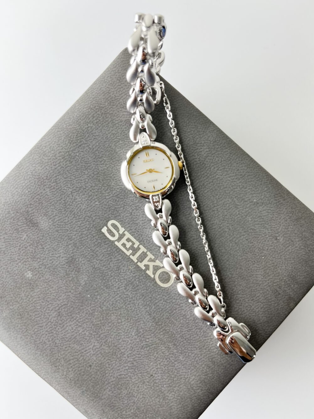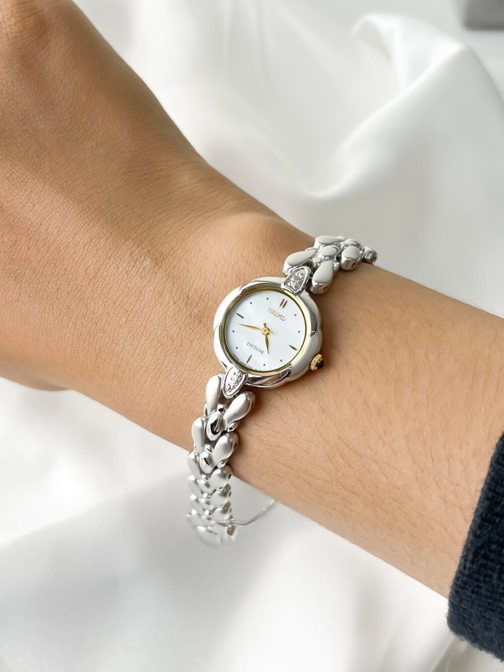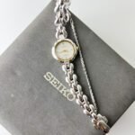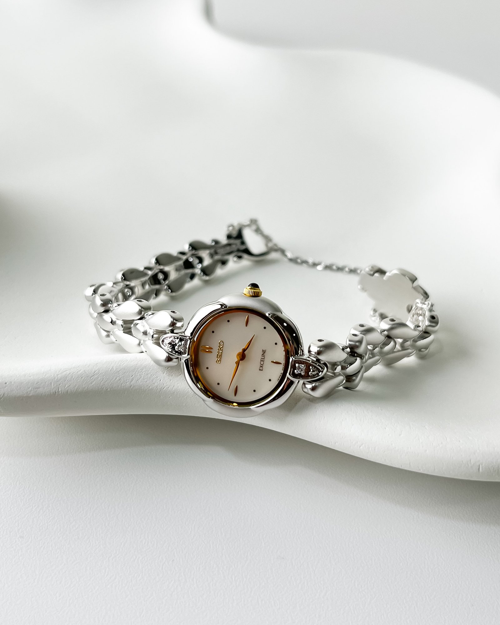 This petite Seiko Exceline wraps the wrist like a shimmering silver vine adorned with frozen dewdrops. It is more than a timepiece; it is a sculptural poem in stainless steel, designed to catch the light with every graceful movement of the hand. With its unique scalloped case and organic, teardrop-shaped links, it feels refined yet quietly sweet—a delicate masterpiece that blurs the line between high-precision horology and fine jewelry.