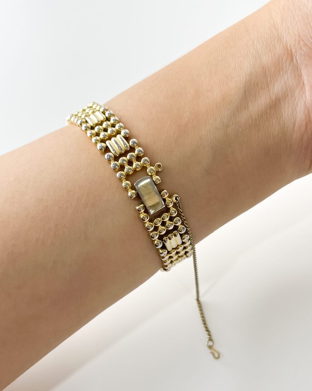 The watch drapes across the wrist with the fluid grace of liquid metal, its intricate bead-link bracelet catching the light in a thousand tiny glints like morning dew on a golden field. There is a soft, rhythmic texture to the metal that warms against the skin, while the champagne-colored dial offers a quiet, sandy depth. Wearing it feels less like checking the time and more like carrying a small, glowing fragment of the late sun wherever you go.