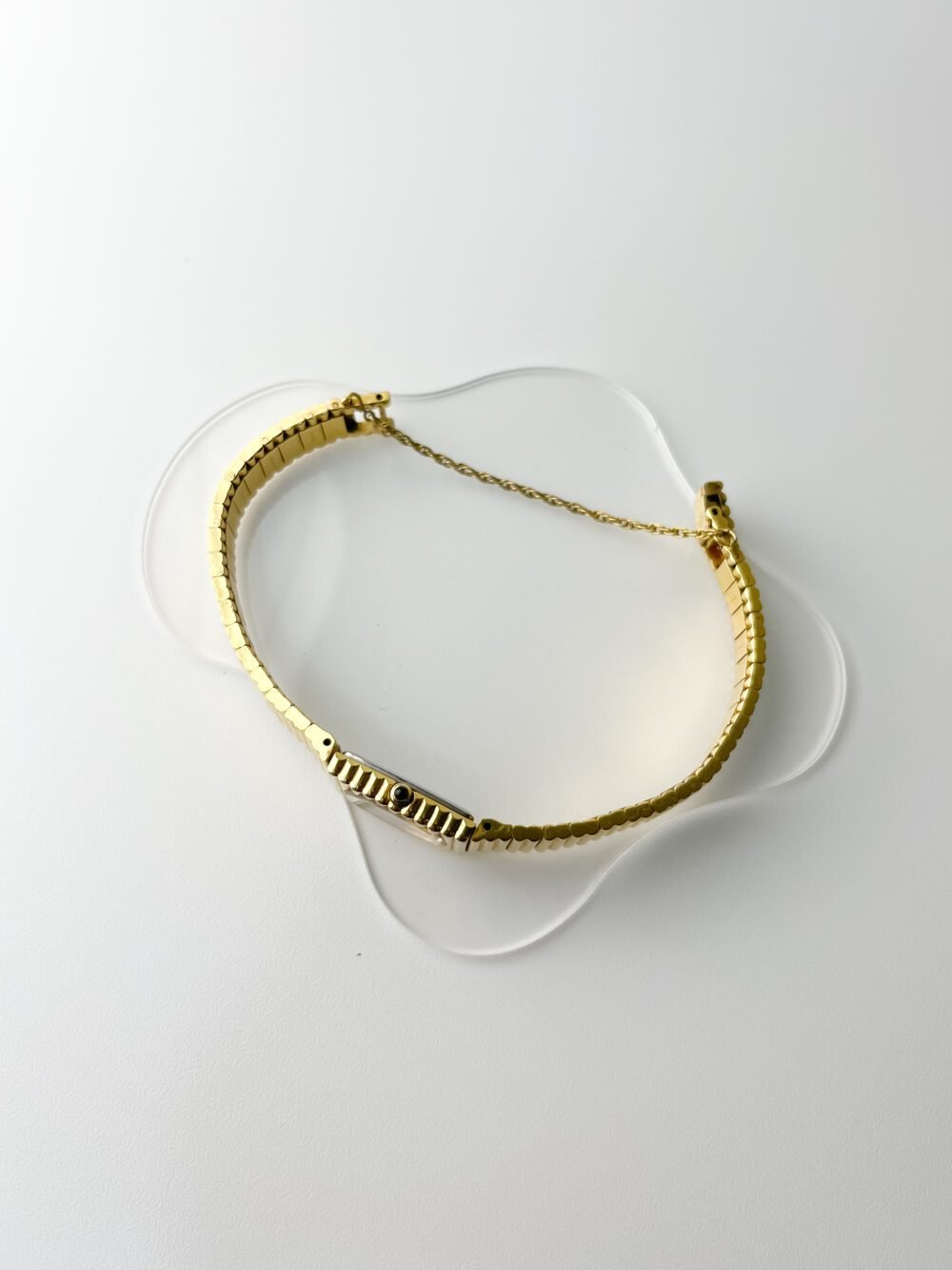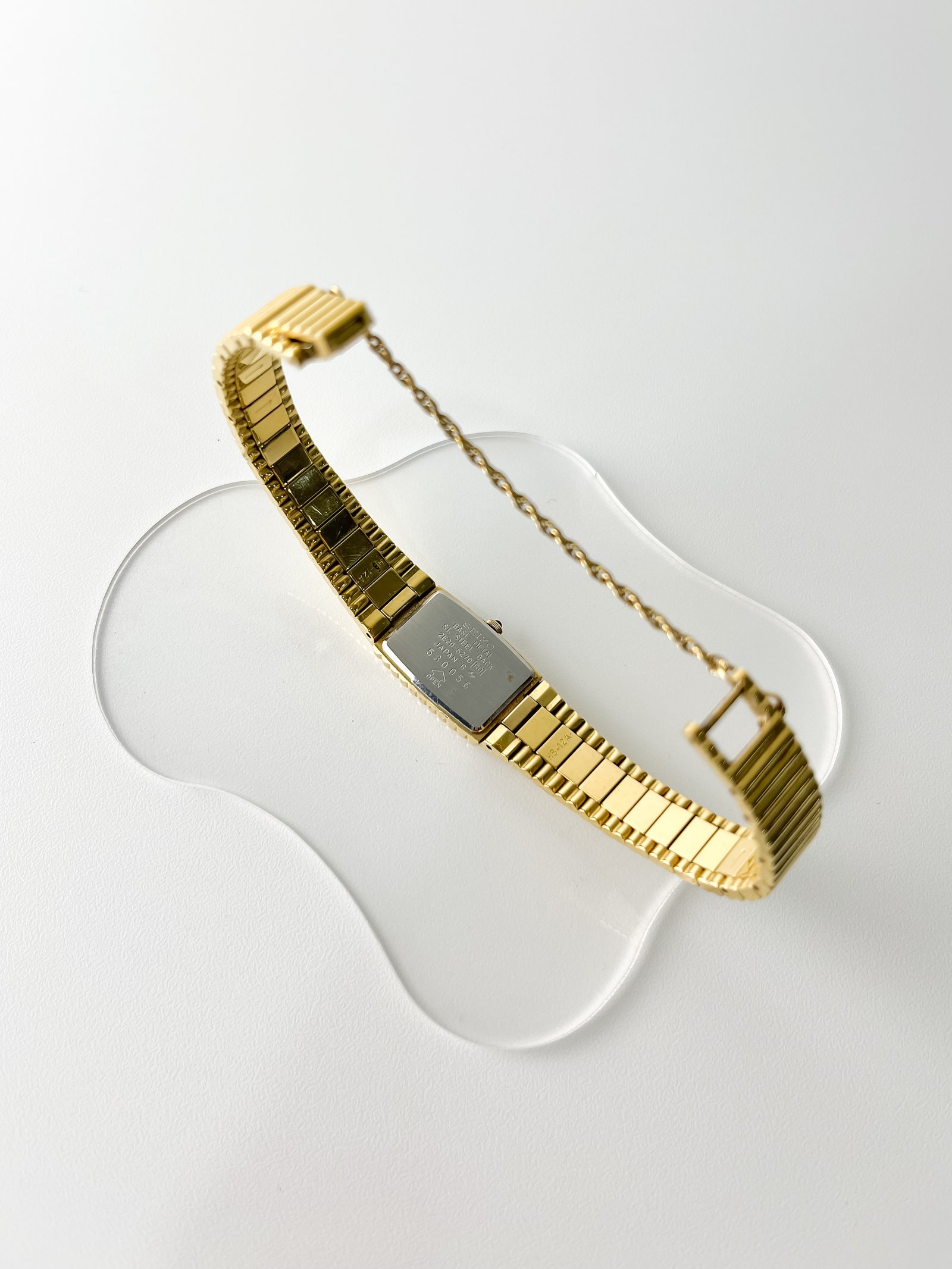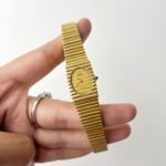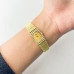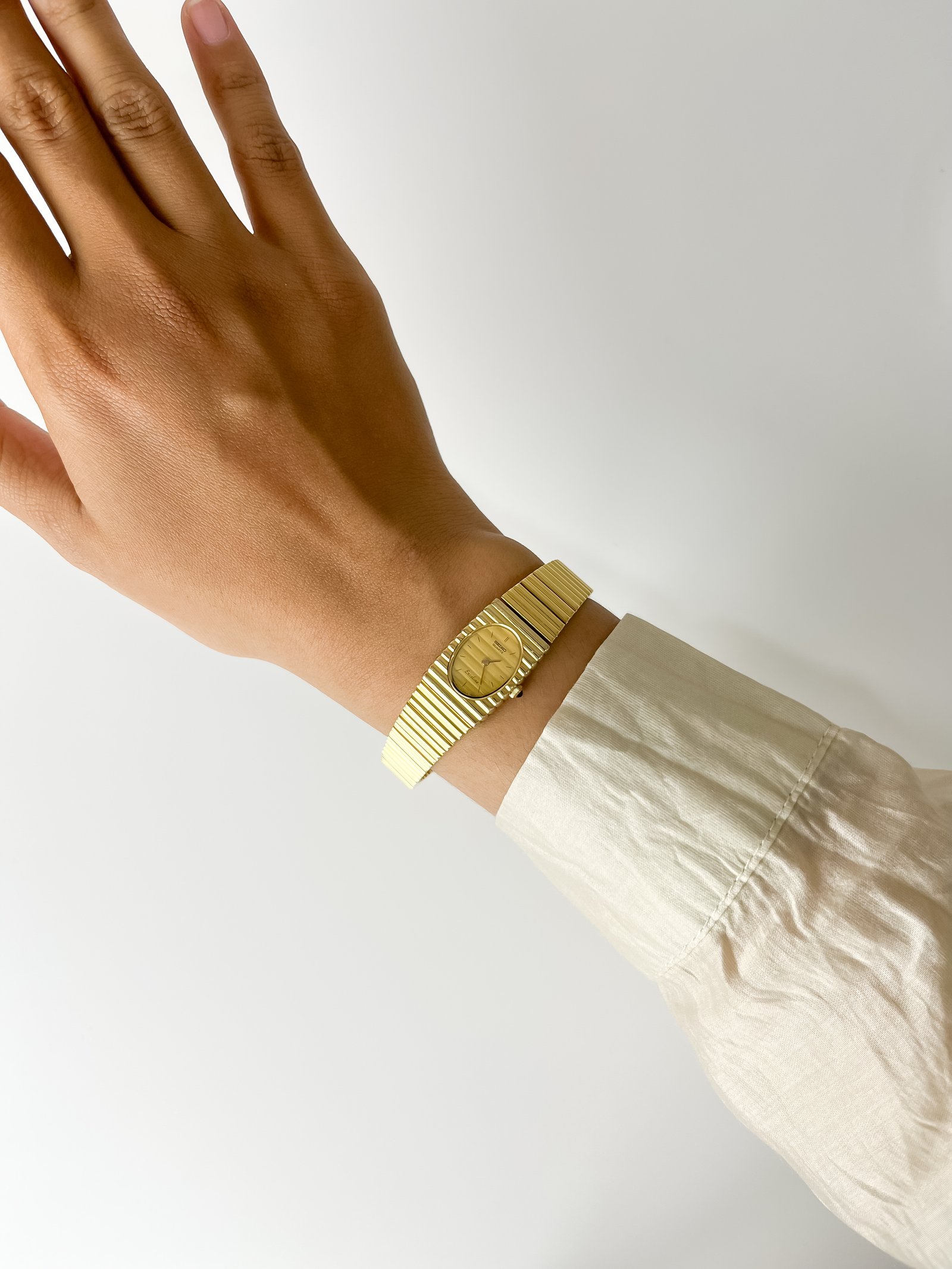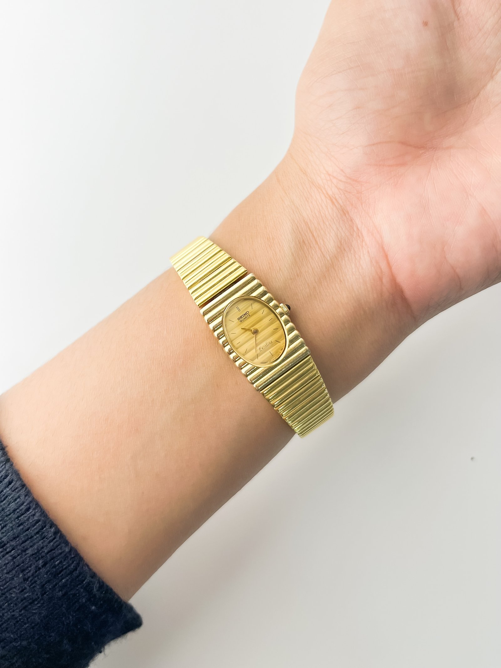 This petite Seiko Exceline is more than a timepiece; it is a gilded tapestry that flows seamlessly around the wrist. Sculpted with a mesmerizing horizontal ribbing that carries a rhythmic, accordion-like grace, it catches the light with a soft, liquid brilliance. It doesn’t just tell time—it adorns the skin like a piece of bespoke sculptural jewelry, feeling refined yet quietly sweet, perfect for those moments that require a touch of vintage gold-tone magic.