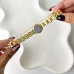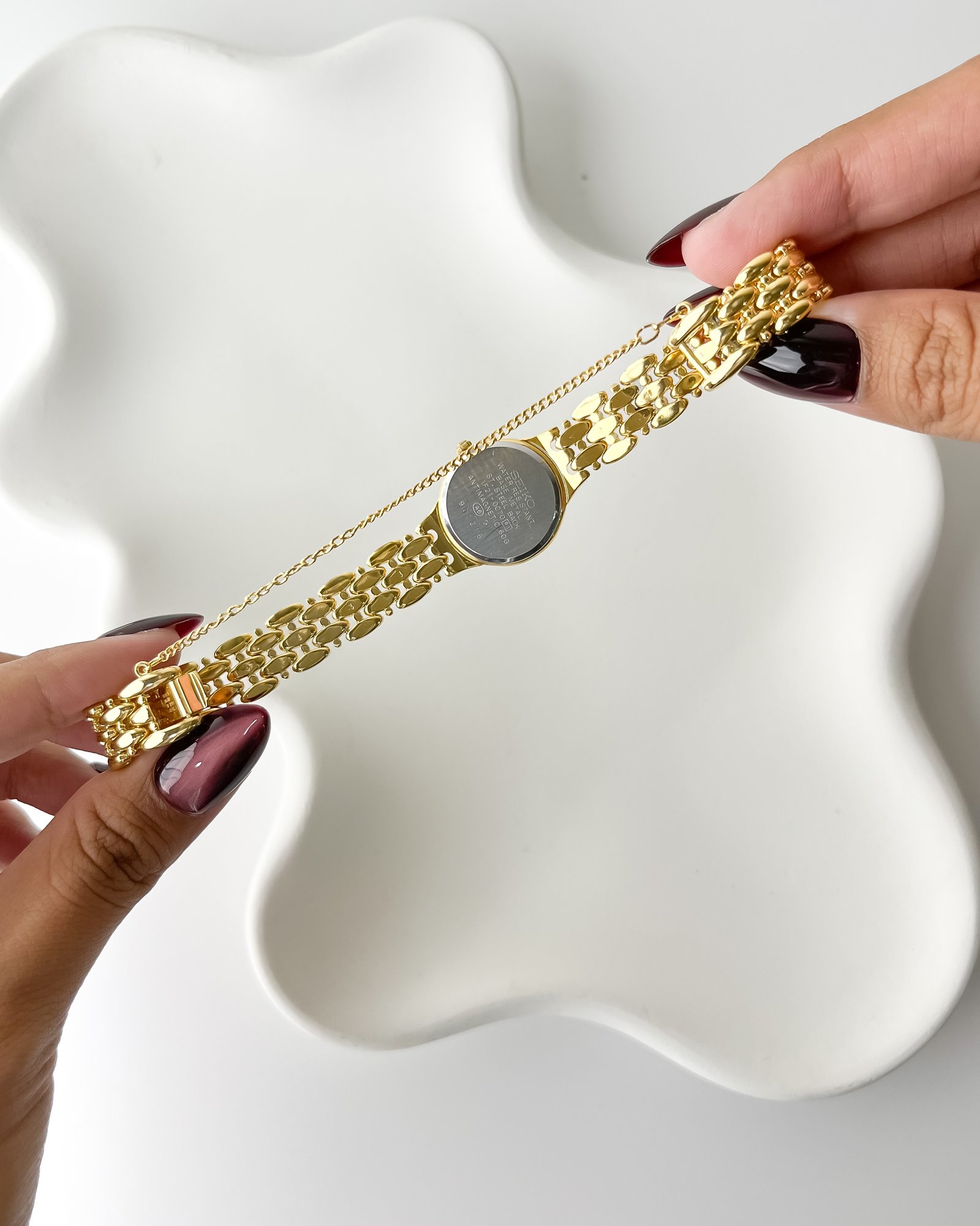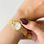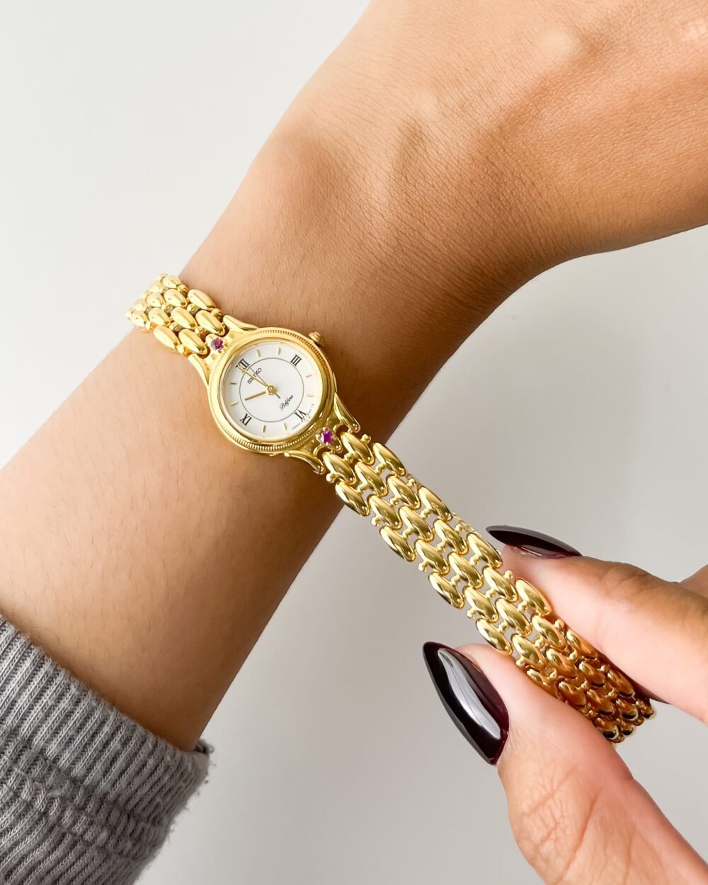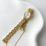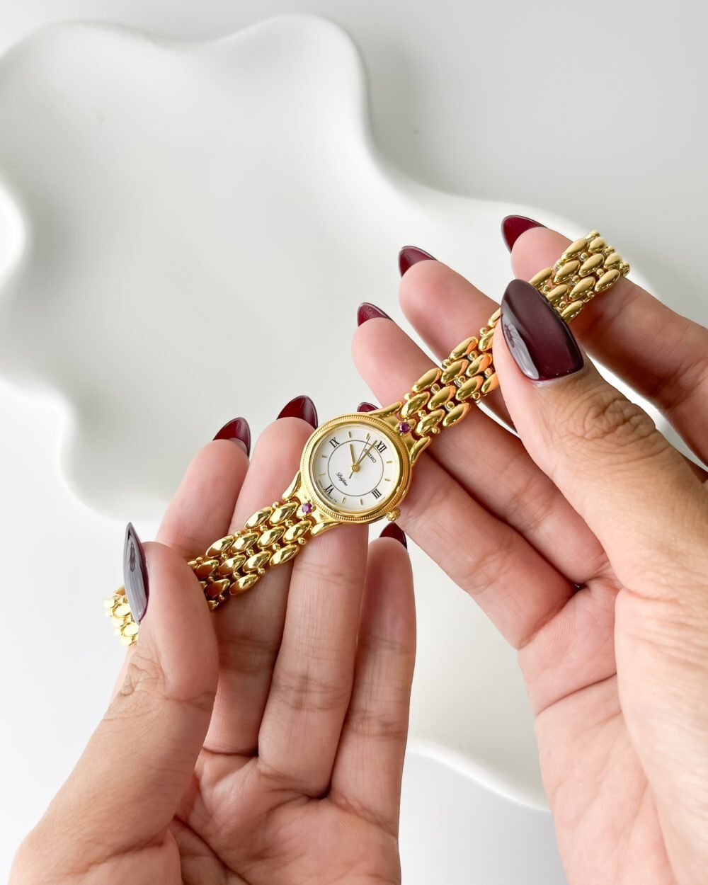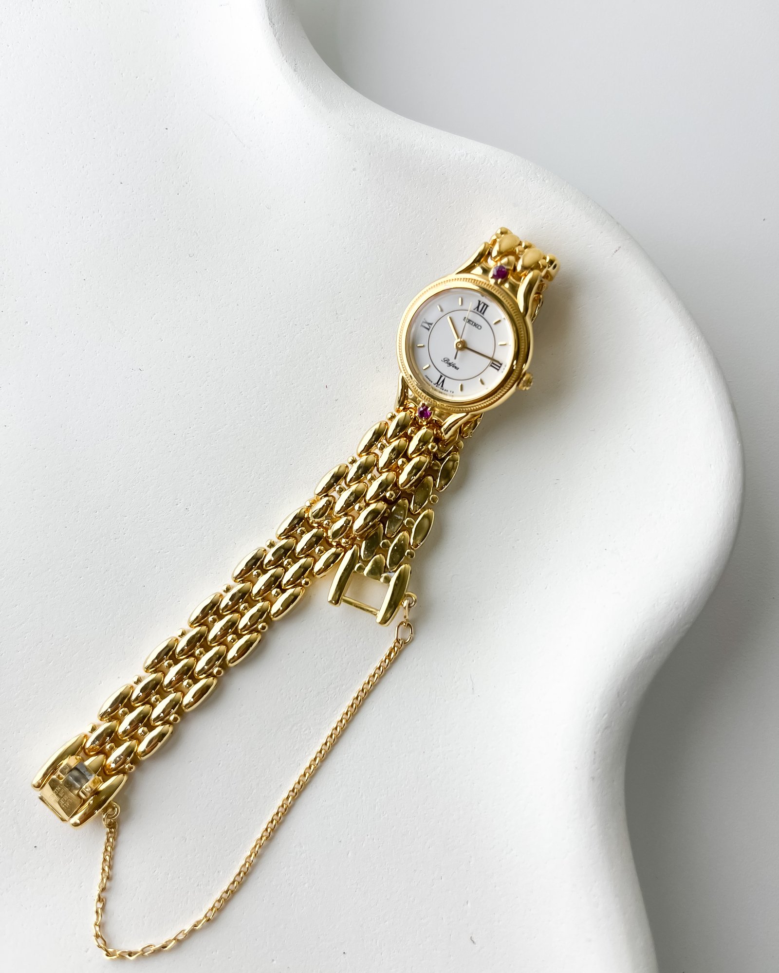 Emerging from the Daini factory’s lineage of ultra-compact movements, this Belfina model utilizes the 1F21 quartz caliber, a marvel of miniaturization designed for high-end jewelry timepieces. Produced during an era where Seiko perfected the “bracelet-first” aesthetic, this watch features a base metal casing with a gold-plated finish and integrated “bead” links. The inclusion of the original safety chain speaks to its heritage as a curated accessory for formal Japanese social circles.
