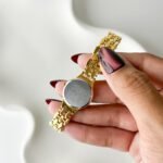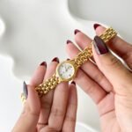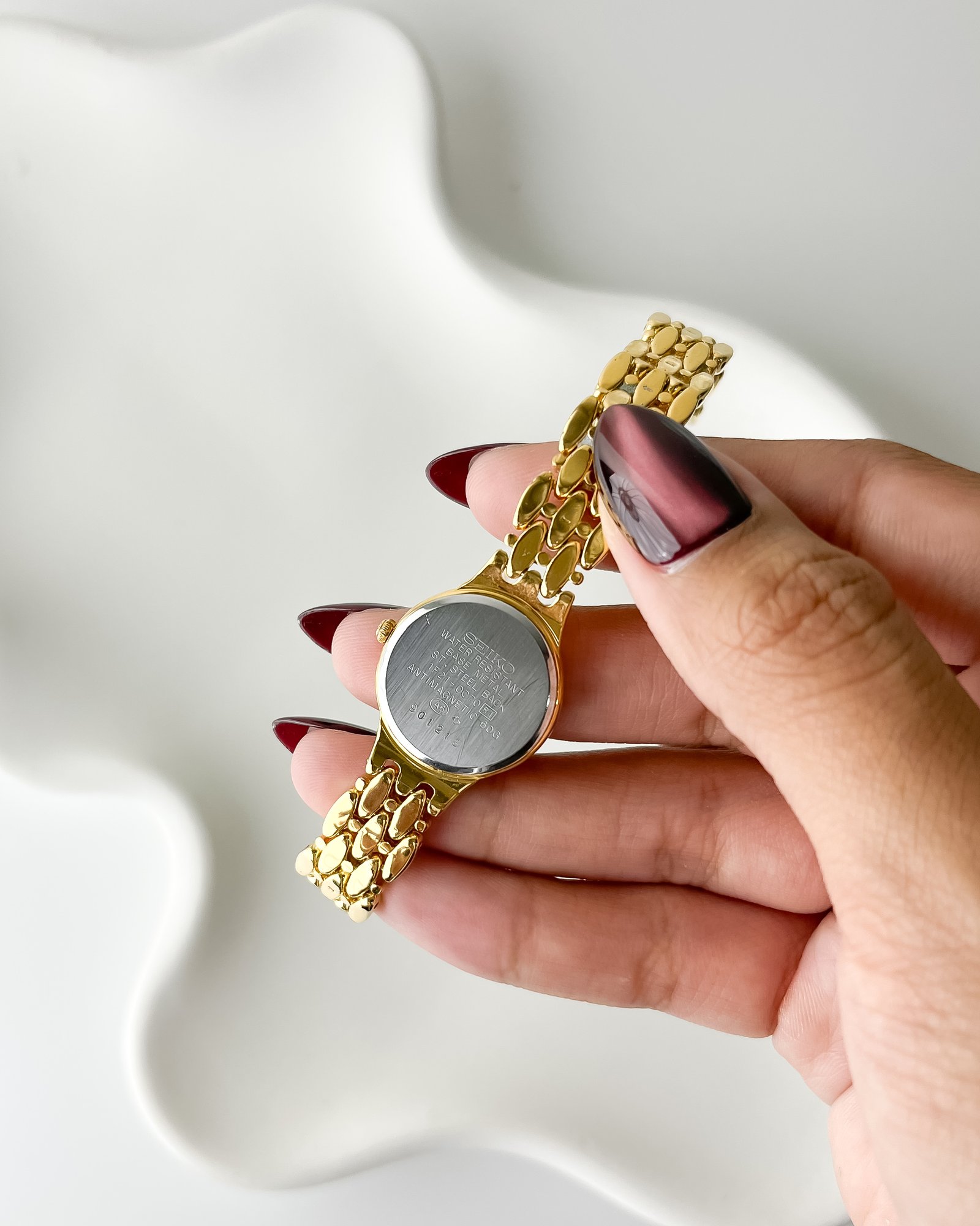 The Honey-toned bracelet drapes over the skin with a weightless, pebble-like texture, catching the afternoon glow in a series of soft, rounded reflections. Tiny crimson accents rest at the lugs, offering a sharp, gem-like contrast to the smooth metal, while the ivory dial provides a clean, porcelain-quiet backdrop for the morning’s schedule. It is a piece that feels less like a machine and more like a permanent, shimmering companion on the wrist.