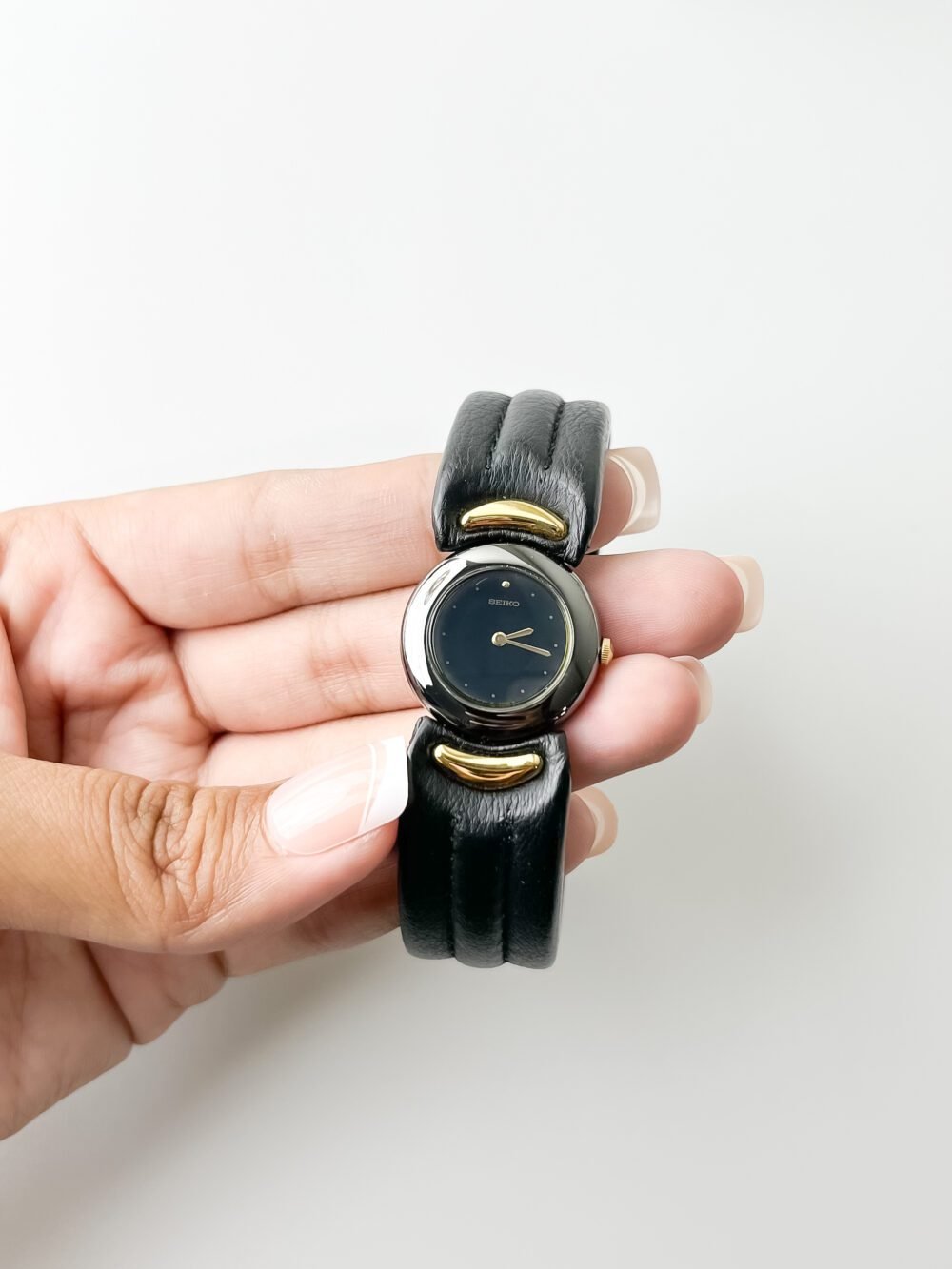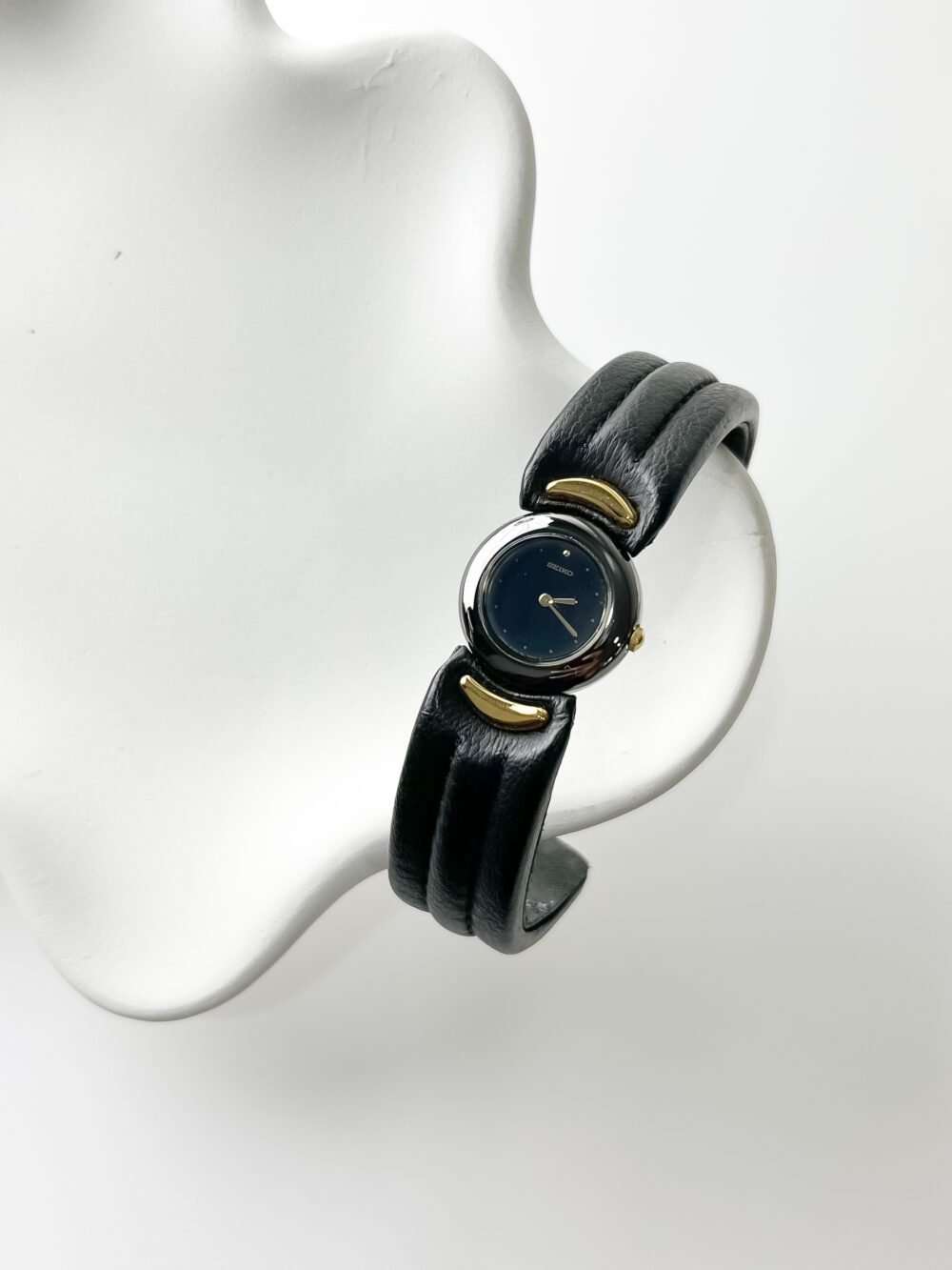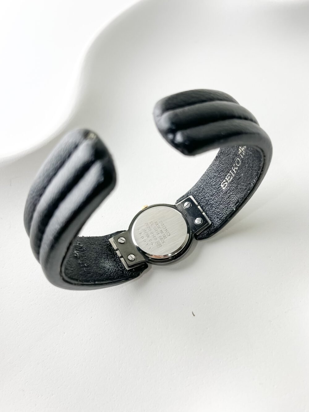 Engineered by the Suwa factory during the mid-1980s, this unique bangle-style timepiece utilizes the high-precision 2C20 quartz caliber. This era represented a bold departure for Seiko, as they experimented with sculptural “lifestyle” timepieces that functioned as high-fashion accessories. The integration of the padded, three-dimensional leather strap directly into the gunmetal-plated case demonstrates a level of industrial artistry rarely seen in daily wear, resulting in a watch that remains a definitive character piece for the discerning collector.