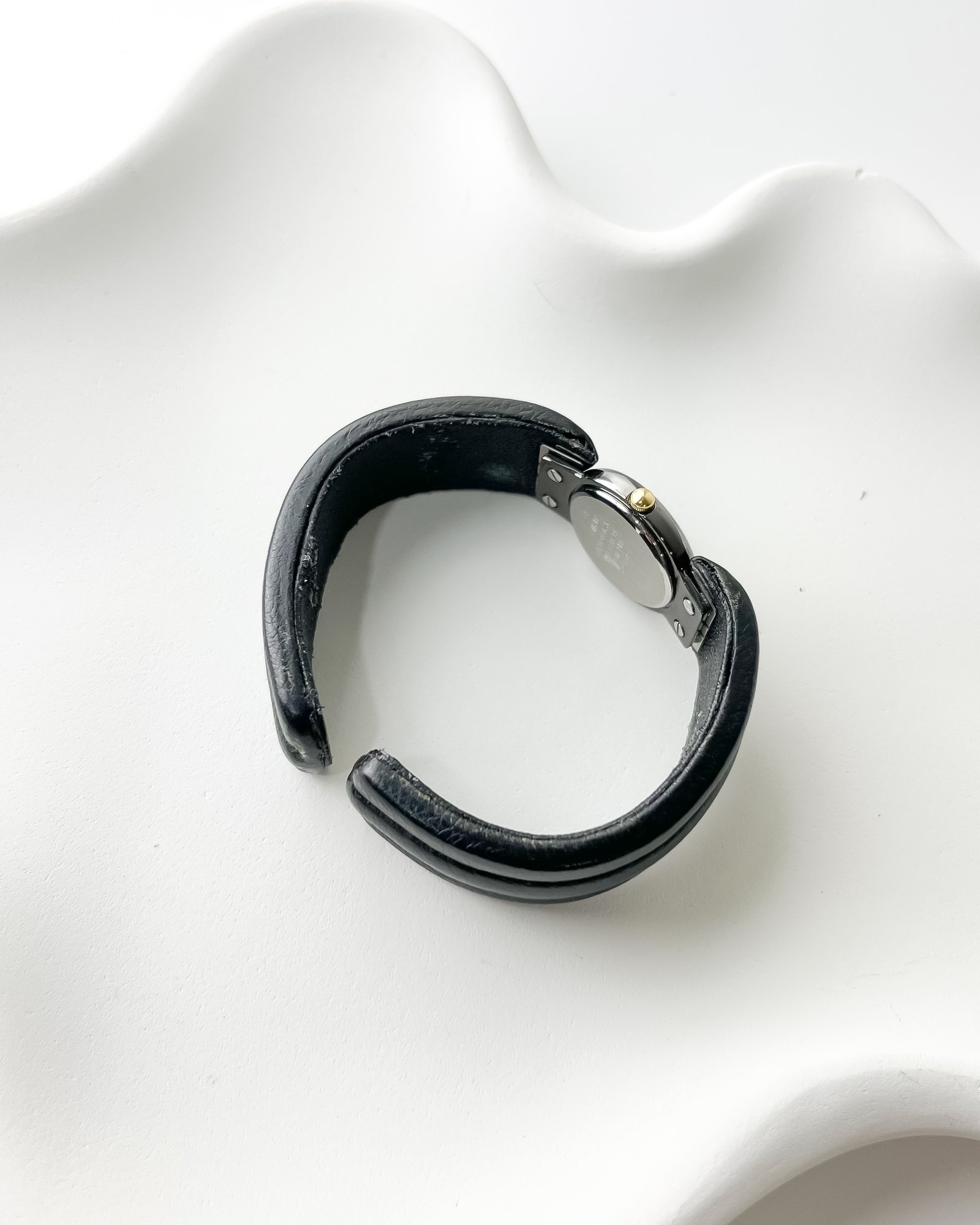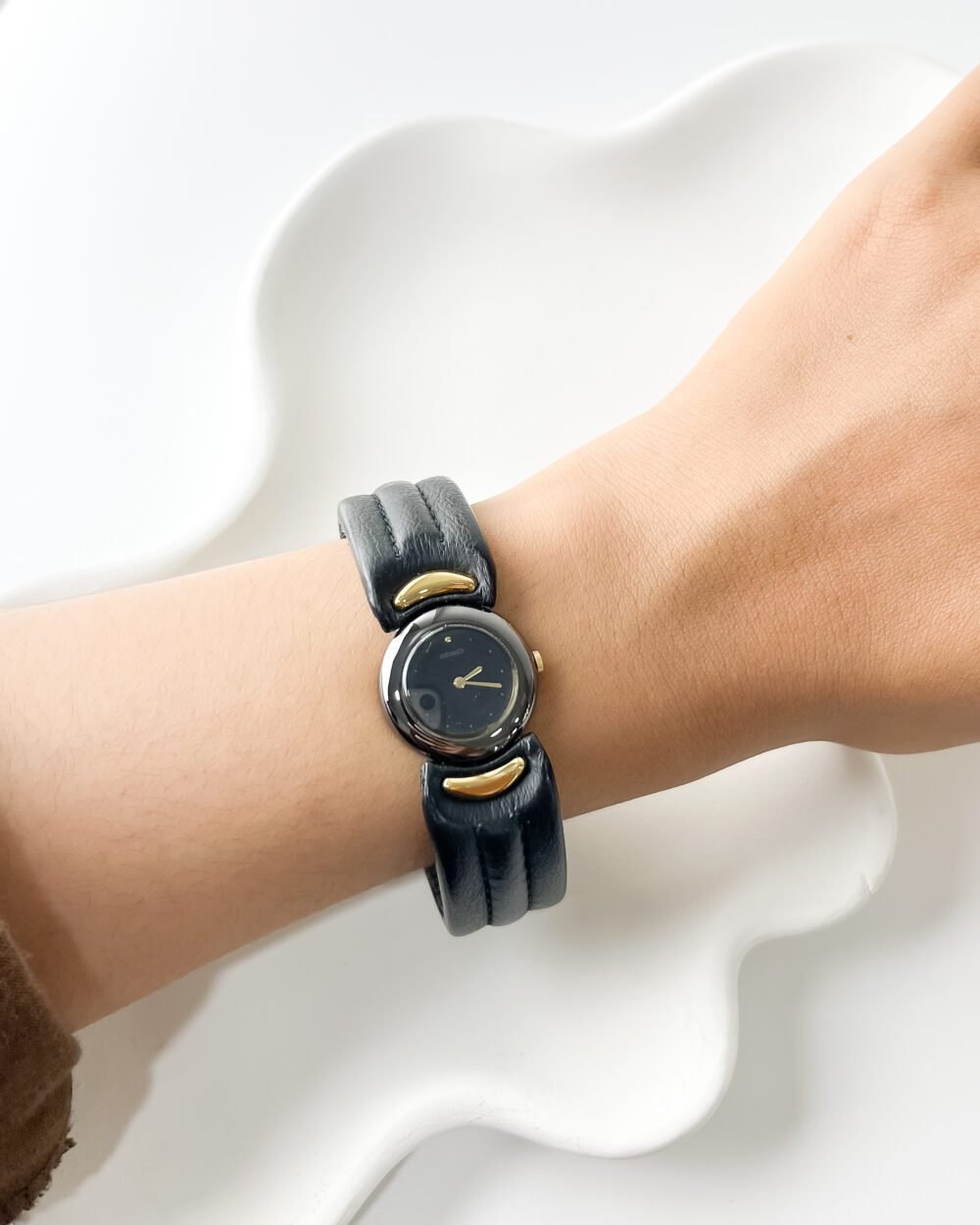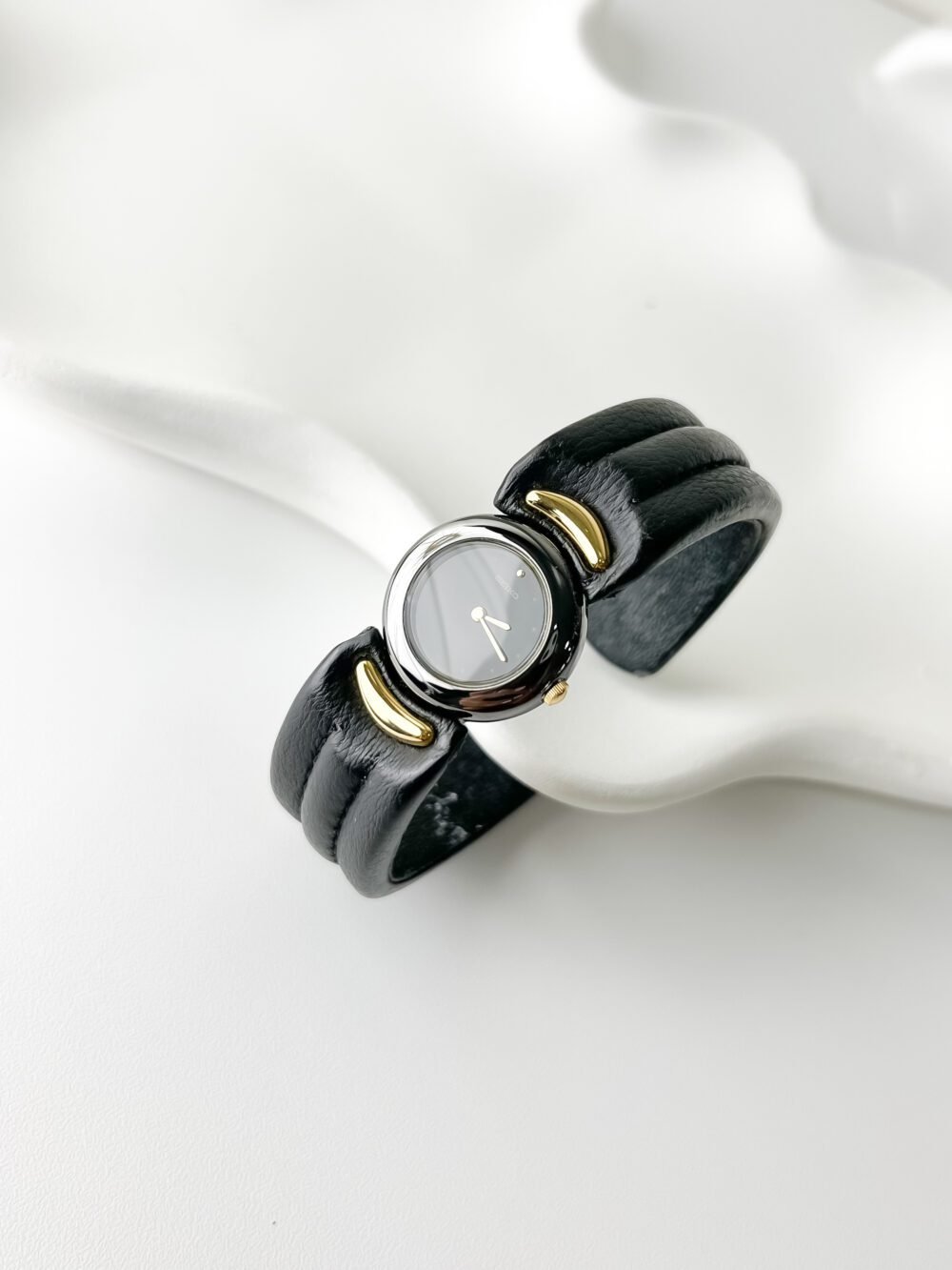 Engineered by the Suwa factory during the mid-1980s, this unique bangle-style timepiece utilizes the high-precision 2C20 quartz caliber. This era represented a bold departure for Seiko, as they experimented with sculptural “lifestyle” timepieces that functioned as high-fashion accessories. The integration of the padded, three-dimensional leather strap directly into the gunmetal-plated case demonstrates a level of industrial artistry rarely seen in daily wear, resulting in a watch that remains a definitive character piece for the discerning collector.