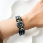 The watch wraps around the wrist with the supple, authoritative grip of a leather cuff, its dark Obsidian textures meeting the cool, smooth touch of polished gunmetal. As the arm moves, the Aurum-hued accents at the lugs catch the light like a brief flash of late sun against a night sky. It is a piece that prioritizes presence and silhouette, turning the simple act of checking the time into a tactile, sensory experience that feels both modern and deeply rooted in personal style.