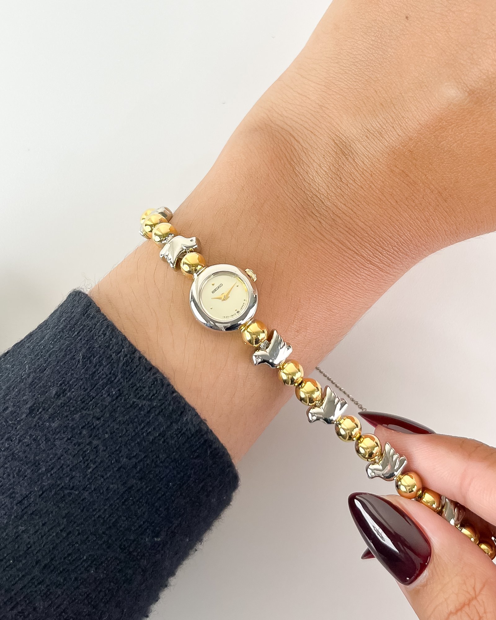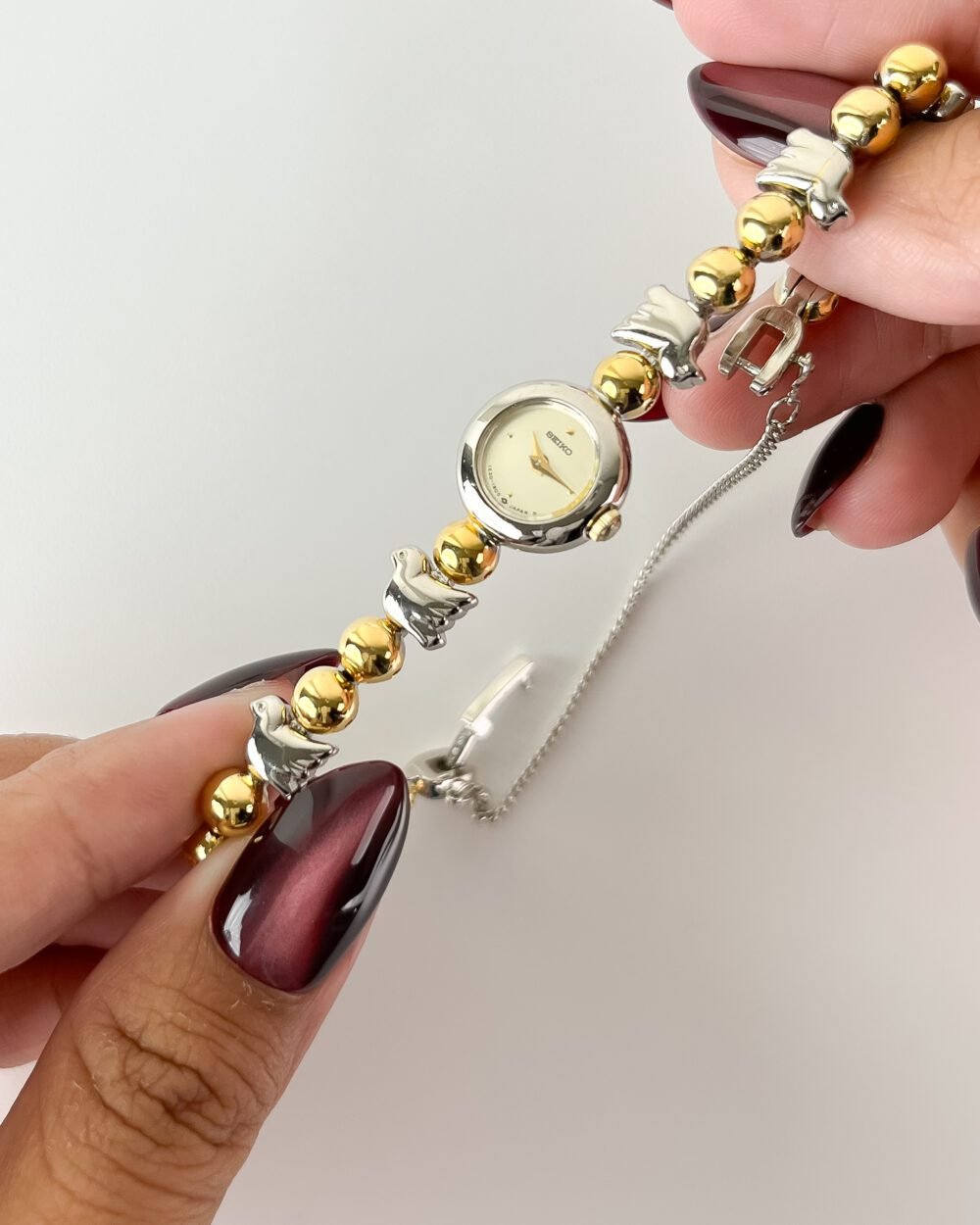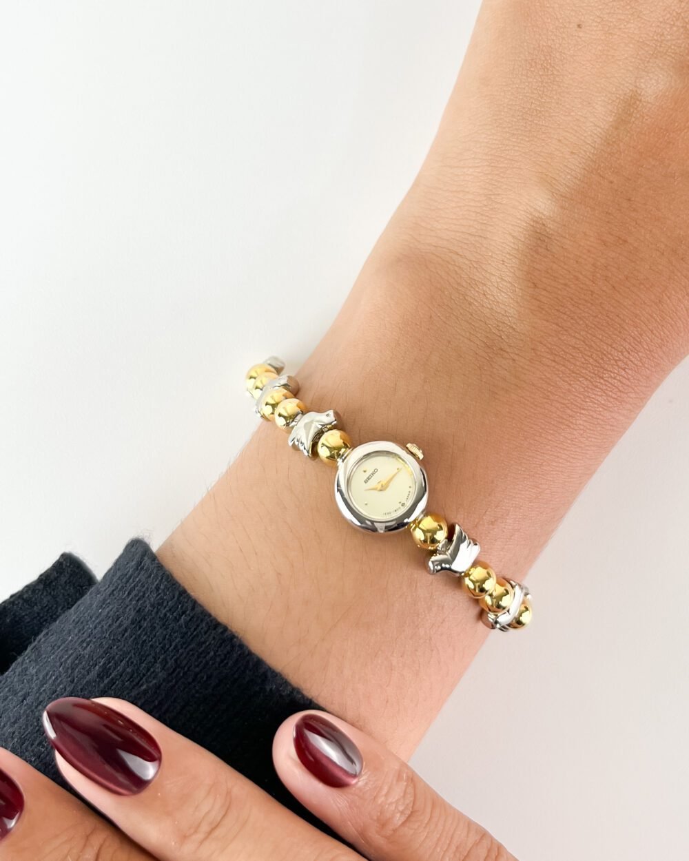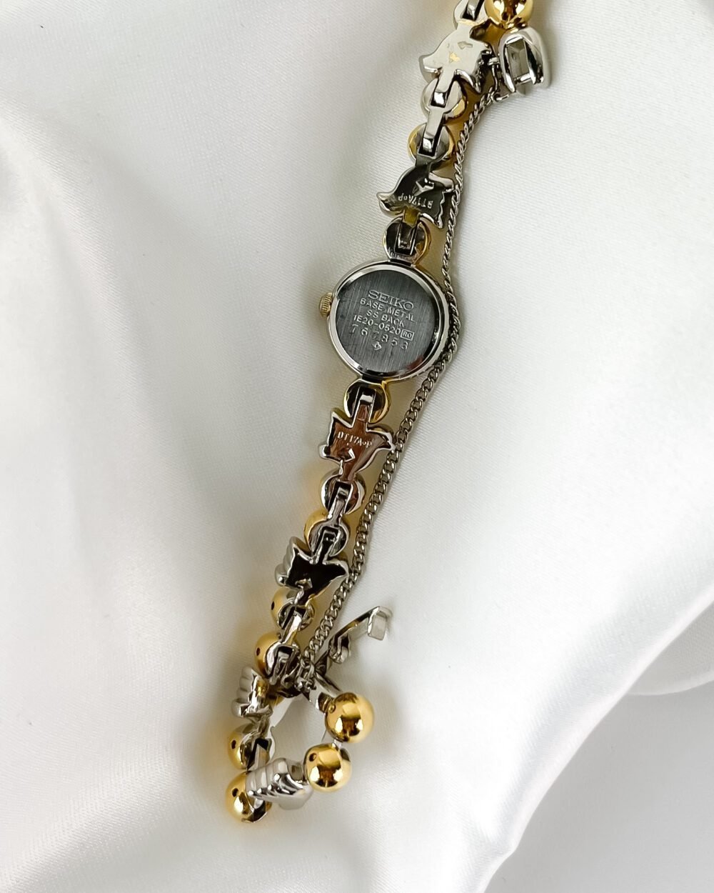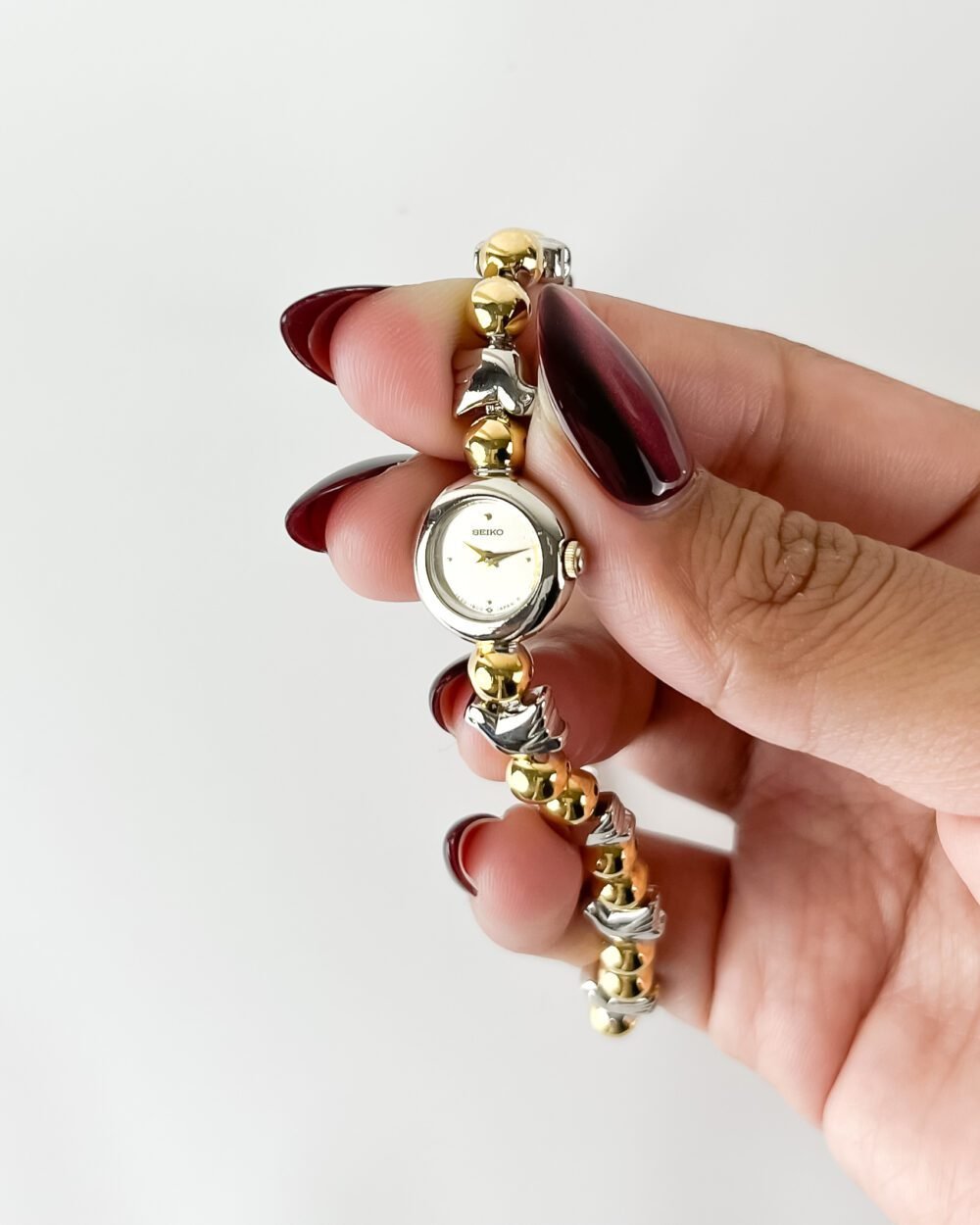 Born from a peak era of Japanese boutique refinement, this Seiko utilizes the ultra-thin 1E20 caliber—a movement specifically engineered to allow for extreme miniaturization in high-tier jewelry timepieces. The architecture is defined by its distinctive “beaded” bracelet and integrated round case, representing a specific late-1980s aesthetic where horology became indistinguishable from fine personal ornament. Preserved in its original mahogany-toned sanctuary, this piece serves as a testament to a time when functional timekeeping was curated as a bold, structural statement.
