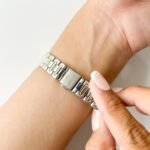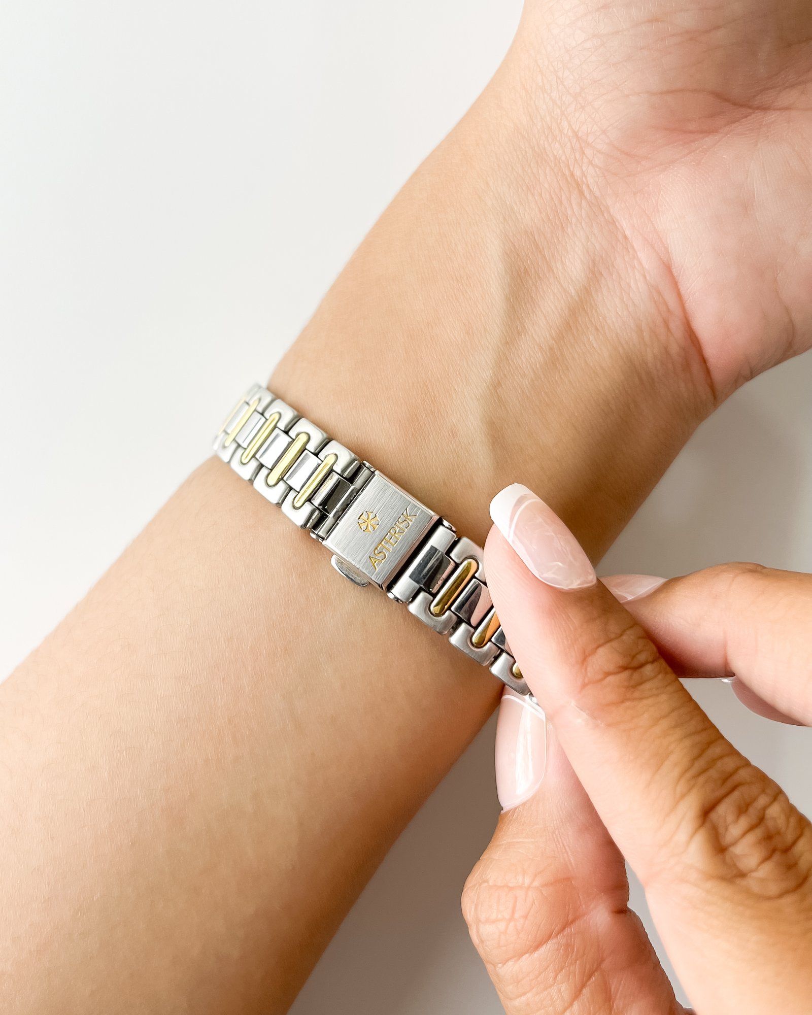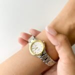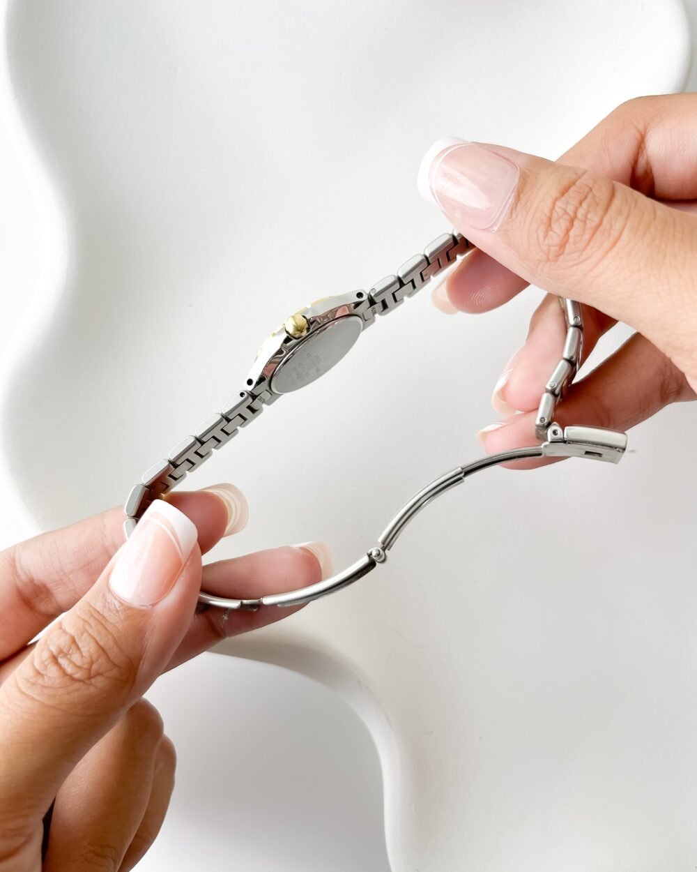 The watch circles the wrist like a delicate band of Late Sun, its integrated bracelet offering a soft, brushed texture that feels more like a fine silk ribbon than cold metal. When it catches the afternoon light, the Aurum plating radiates a muted warmth, while the tiny, pearlescent dial remains clean and undisturbed, offering just enough clarity to mark the passing of the quiet hours. It is an object designed to be felt rather than announced, providing a sensory experience of lightness and effortless presence.