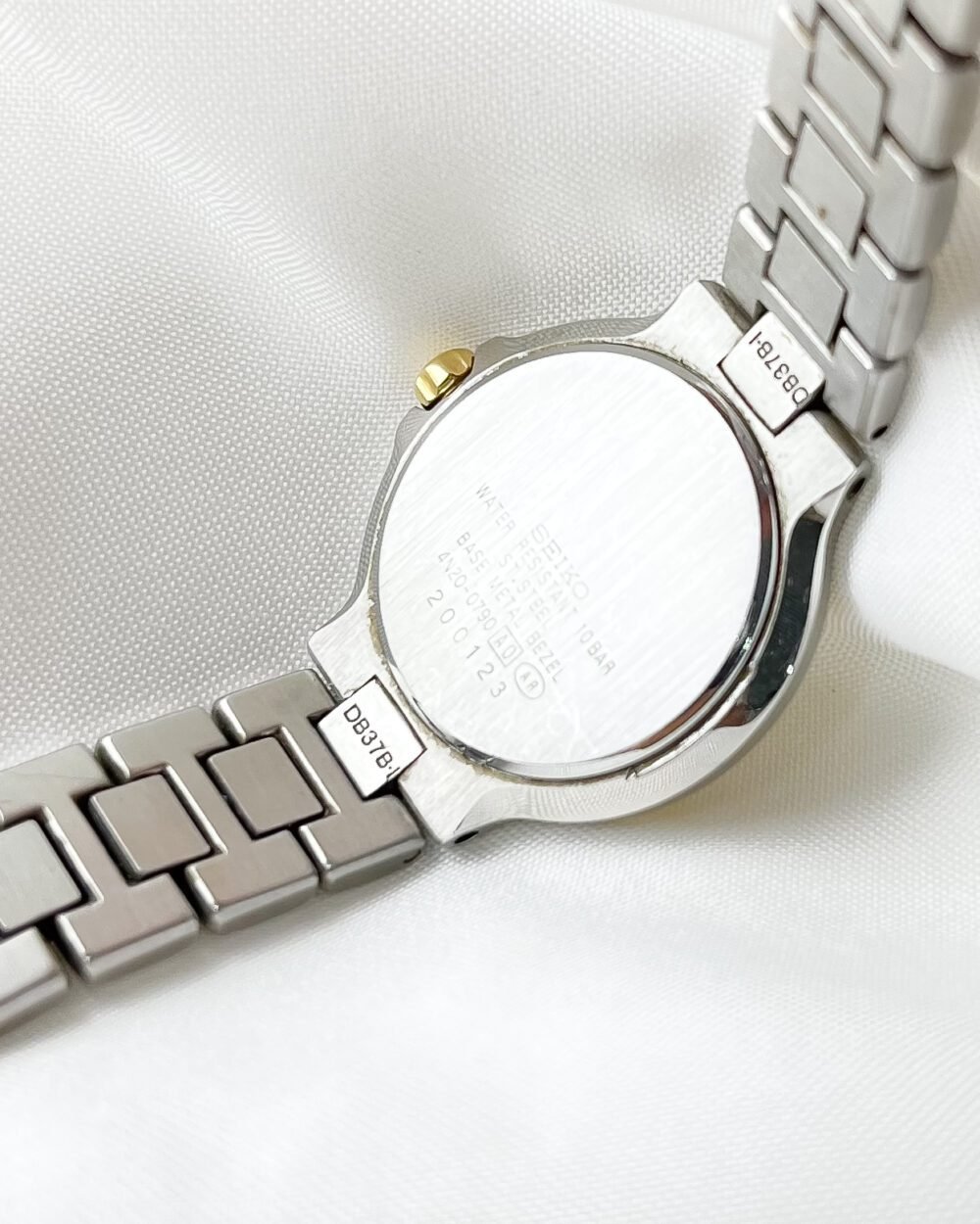 A product of the refined Suwa factory expertise, this Seiko utilizes the caliber 4N20—a movement specifically engineered during the late 1980s and early 90s to power their most slender, jewelry-adjacent timepieces. The architecture is defined by its ultra-thin “tank” profile and the way the bracelet flows seamlessly from the case, a hallmark of the era’s focus on non-intrusive luxury. Preserved within its original textured sanctuary, this piece serves as a physical record of a time when Seiko perfected the art of making a precision instrument feel like a whisper on the skin.