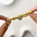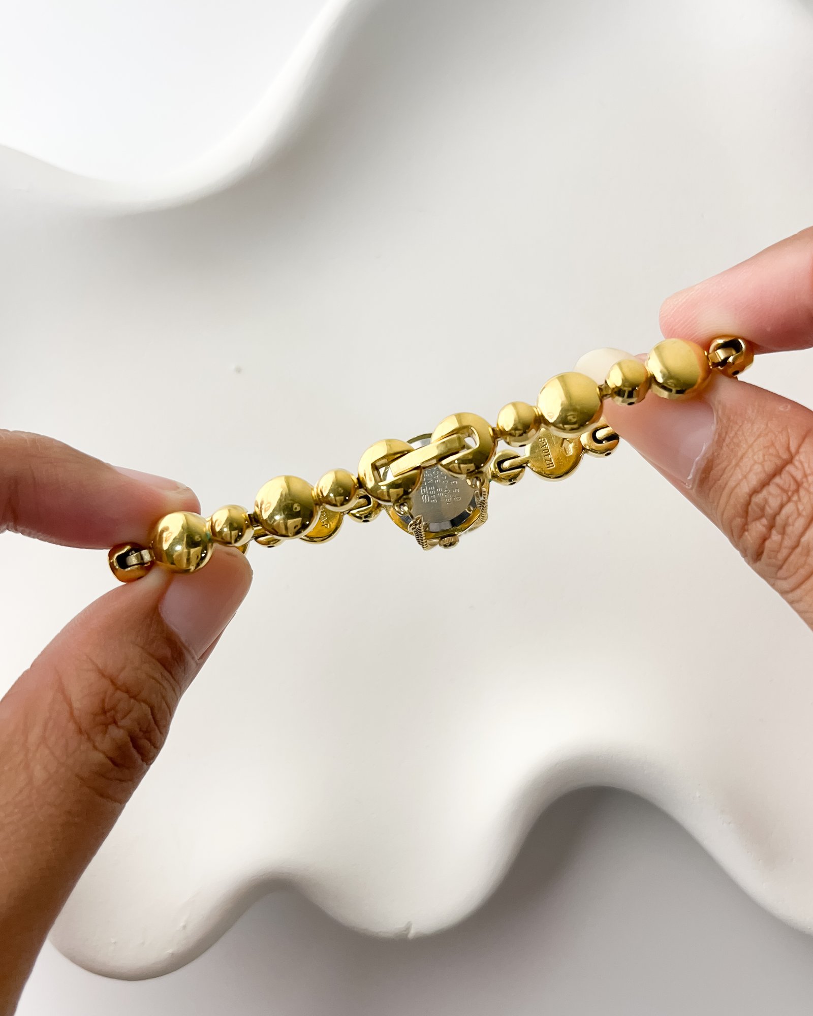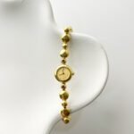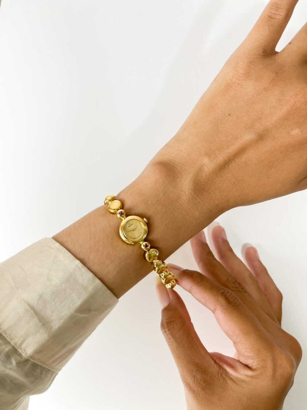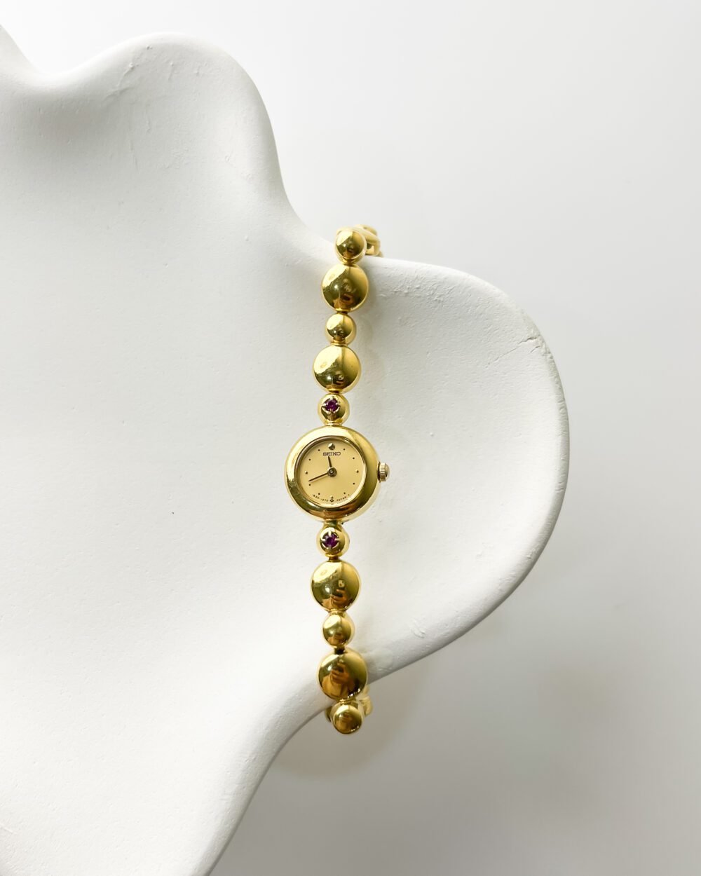 There is a distinct softness in the way the Aurum-toned spheres drape across the skin, a sensation comparable to a strand of liquid gold. Each polished link feels like a rounded pebble smoothed by a river, catching the Late Sun light and throwing warm, honeyed reflections with every movement of the hand. The two crimson stones flanking the case act as sharp, vivid punctuations, drawing the eye toward a dial that shares the same golden glow. It is a quiet luxury, one that prioritizes the way a piece rests and moves against the body over mere visibility.
