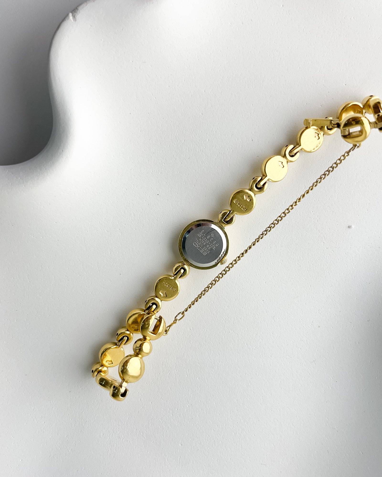 This Seiko 1E20-0420 is a remarkable specimen from the era of Japanese miniaturization, where the goal was to shrink a reliable timekeeper into the dimensions of a fine evening bracelet. The 15mm case is a feat of engineering, housing the ultra-thin Caliber 1E20 quartz movement that allowed Seiko to compete with the high-jewelry houses of Europe. The integration of the bubble-link bracelet and the protective safety chain speaks to a 1990s design philosophy that viewed the watch as a fundamental accessory to the evening silhouette. Preserved with its original box, it remains a soulful reminder of a time when precision was disguised as art.