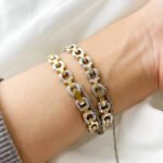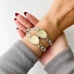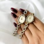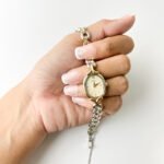 The watch drapes across the wrist with the fluid grace of Mercury-silver links, each punctuated by a soft Honey-toned “Y” architecture that catches the ambient light. The oval case rests with a weightless, jewelry-like quality, while the champagne sunray dial reflects the Late Sun, creating a warmth that feels personal and intimate against the skin. It is a piece that prioritizes tactile rhythm, moving seamlessly with the wearer like a curated heirloom.