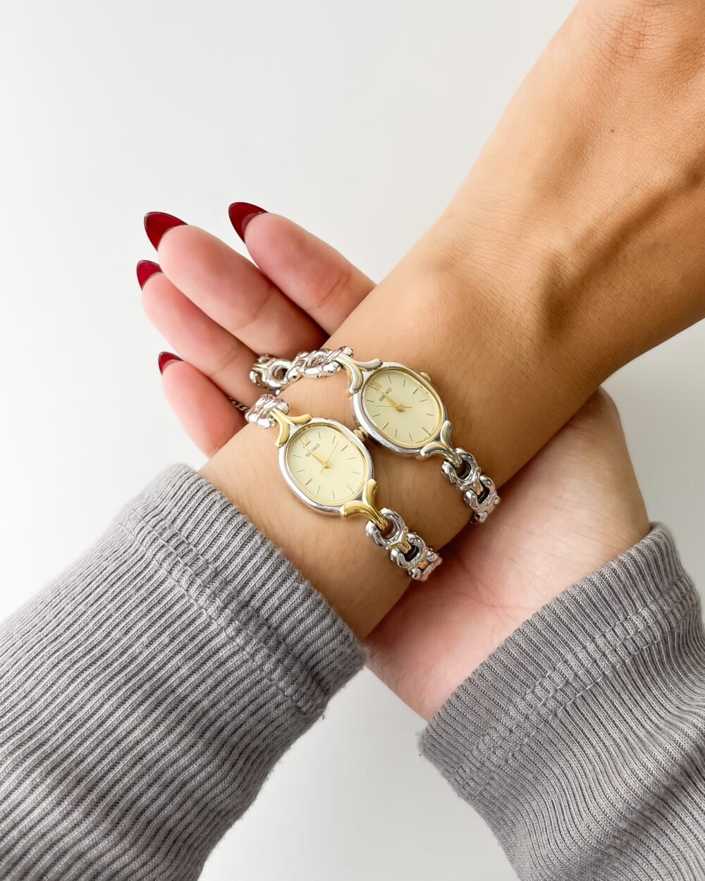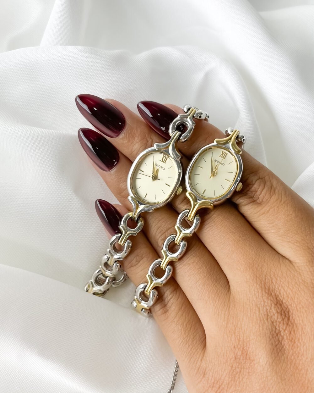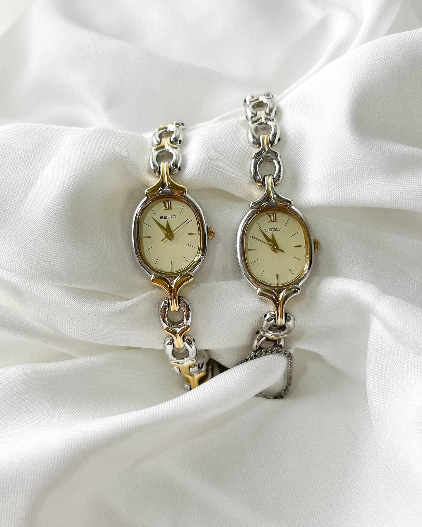Born from the Suwa factory lineage of high-precision quartz, this Seiko utilizes the ultra-thin 2P21 caliber, a movement specifically engineered for the refined dimensions of late 20th-century boutique watches. The bi-color H-link design represents a moment in horological history where Japanese engineering sought to bridge the gap between functional timekeeping and formal jewelry aesthetics. With its integrated safety chain and original branded clasp, it serves as a testament to an era of meticulous finishing and architectural intentionality.