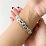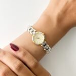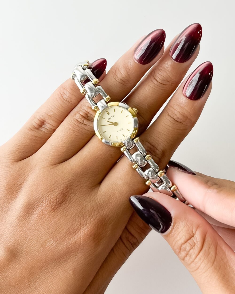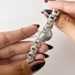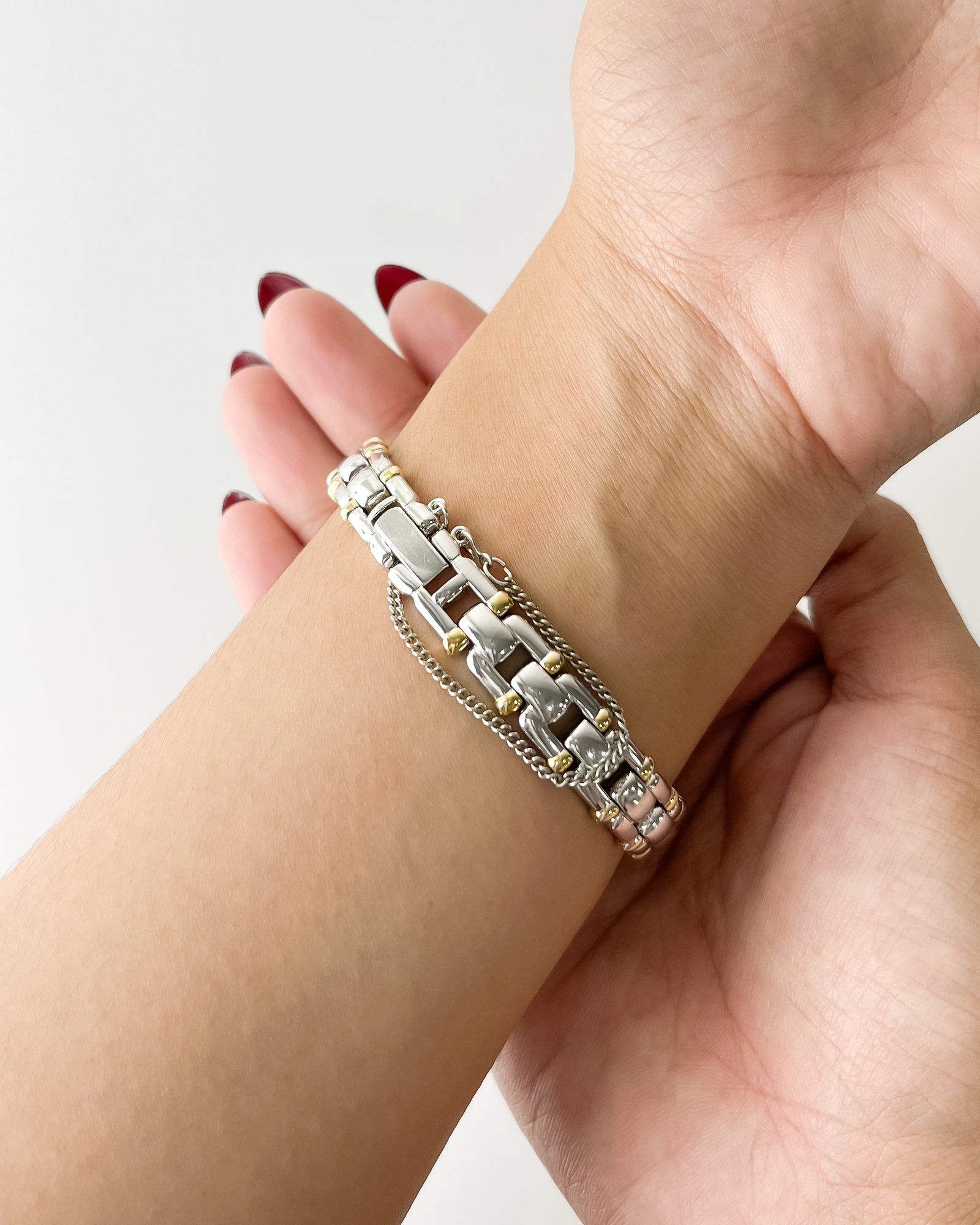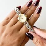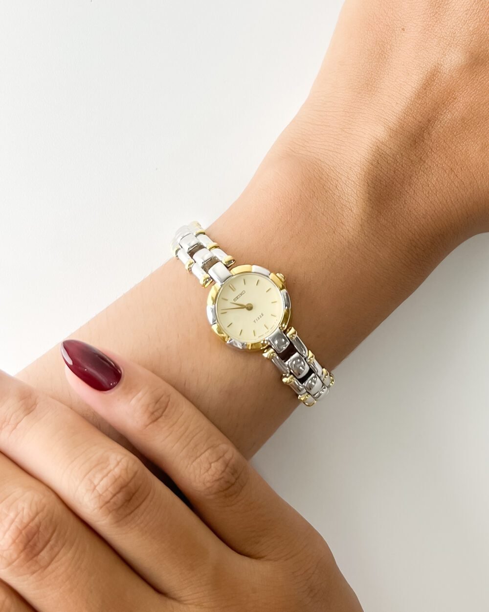 The watch drapes across the wrist with the fluid grace of Mercury-silver links, punctuated by tiny, rhythmic bursts of Honey-gold that catch the ambient light like streetlamps reflecting off a wet Ginza pavement. Against the skin, the polished metal feels exceptionally cool and smooth, while the cream-toned dial offers a quiet, sandy depth that makes the passage of time feel personal and intimate. It is an accessory that prioritizes the tactile sensation of its architectural weave, resting with a weightless presence that seamlessly integrates into a curated silhouette.