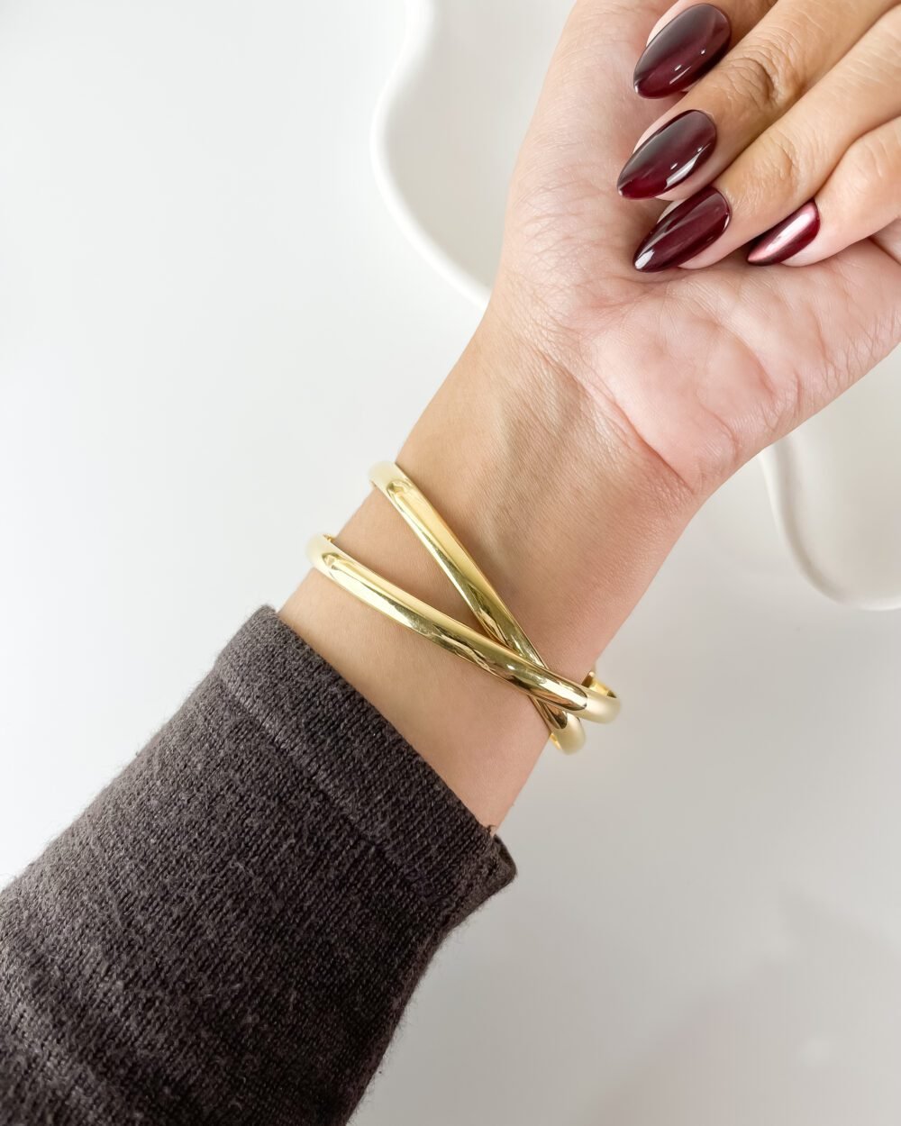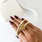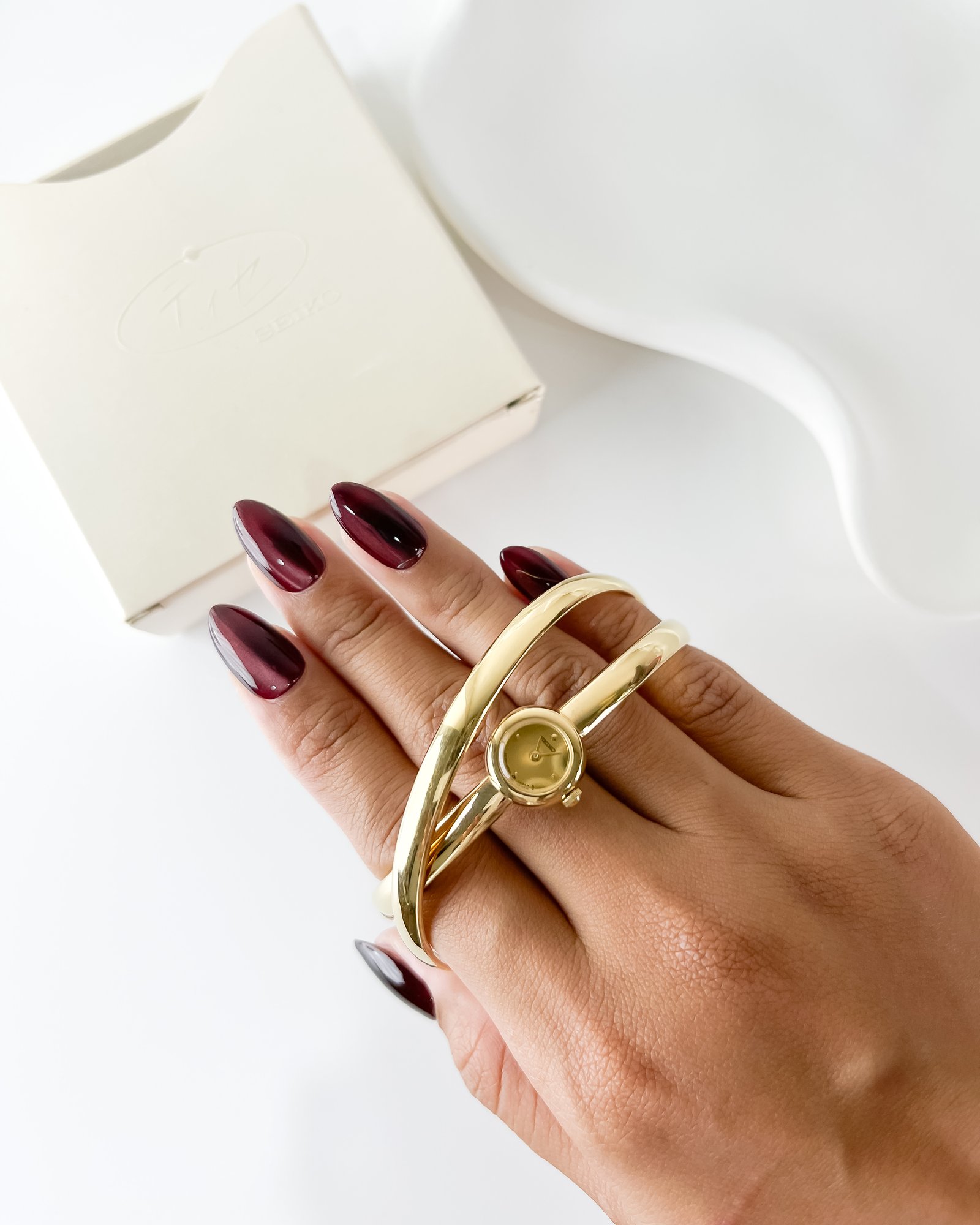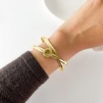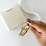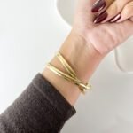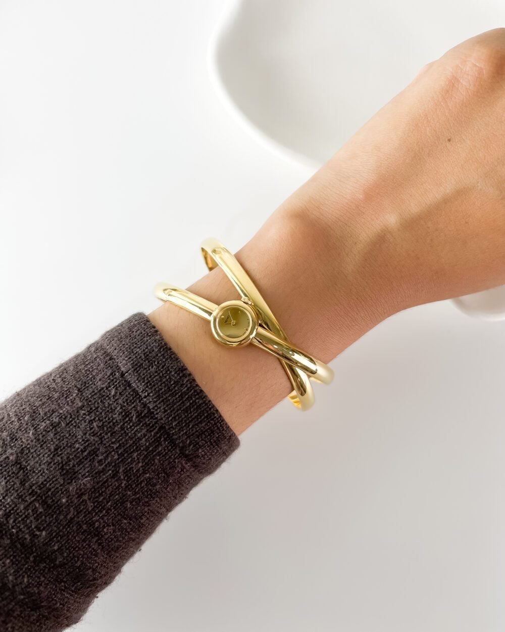 The moment it snaps onto the wrist, the watch disappears into a fluid, sculptural loop of polished Aurum. It feels less like a timekeeper and more like a golden thread woven around the arm, catching the late sun with every gesture. The circular dial, small as a drop of Honey, sits at the intersection of two crossing paths, creating a silhouette that feels weightless and entirely organic against the skin.