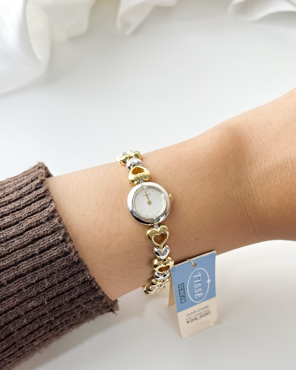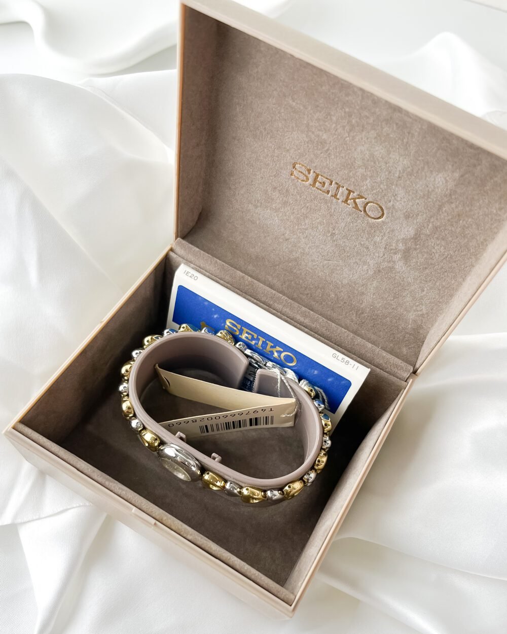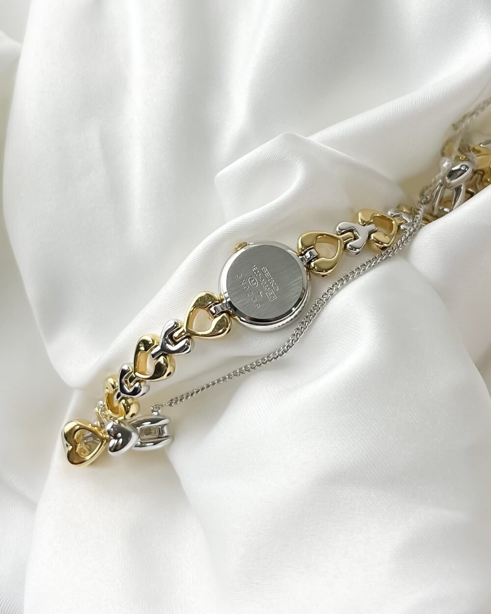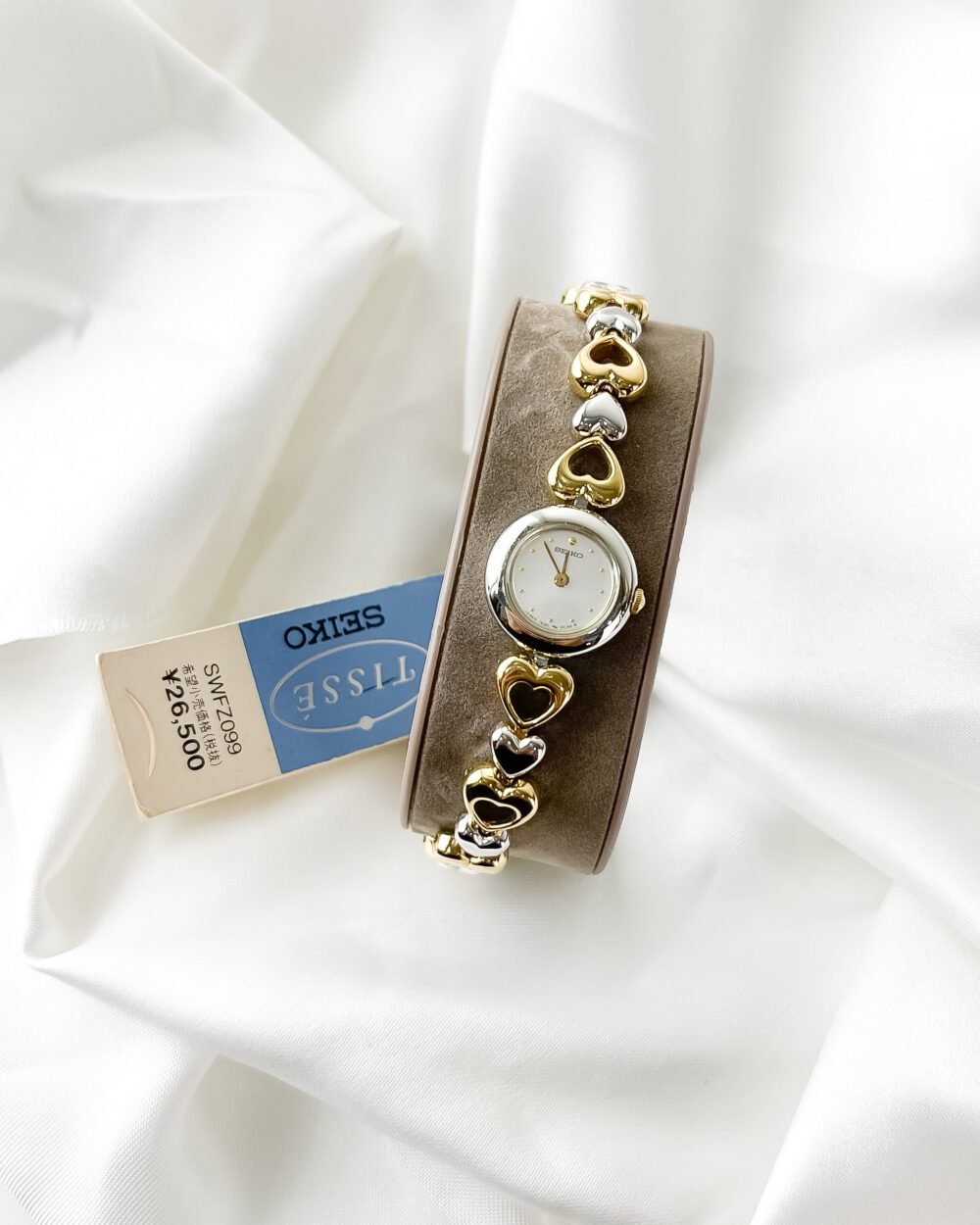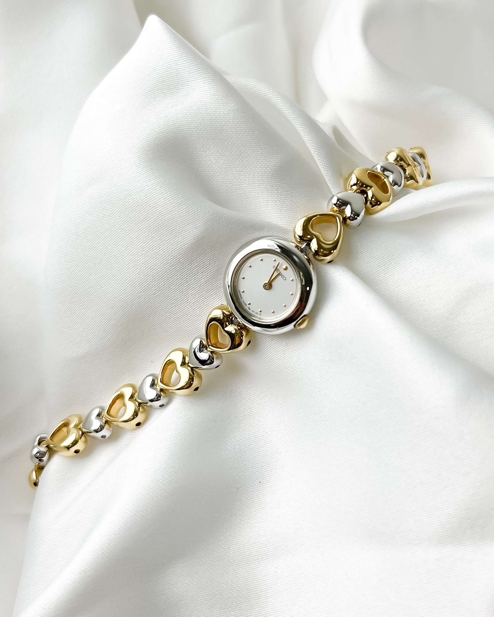 Beneath the petite, minimalist dial lies the Seiko 1E20 caliber, a testament to the Daini factory’s mastery in miniaturization. During an era where Seiko pushed the boundaries of how small a reliable quartz movement could be, the Tissé line emerged as the bridge between high-end horology and fine jewelry. This specific reference, with its alternating bicolor heart motif and original “Full Set” presentation, captures a specific 1990s Japanese aesthetic—one that favored playful femininity without sacrificing the rigorous engineering standards of the Suwa-Daini legacy.