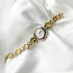 The cool touch of polished mercury and honey-toned gold meets the skin not as a tool, but as a piece of intimate jewelry. This Tissé feels like a secret kept on the wrist—a delicate weight that catches the light in rhythmic flashes as the heart-shaped links shift with your every movement. It doesn’t just tell time; it frames the pulse with a soft, romantic geometry that feels remarkably personal.